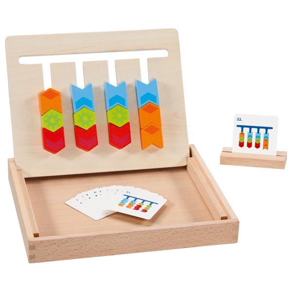 Durch verschieben der Positionen werden bei diesem Holzspiel die Farben sortiert, das erfordert nicht nur räumliche Orientierung, sondern auch Planung. Das Farbsortierspiel im Holzkasten ist beidseitig bespielbar und die 32 Aufgaben in unterschiedlichen Schwierigkeitsgraden, von Anfänger bis Fortgeschrittene.