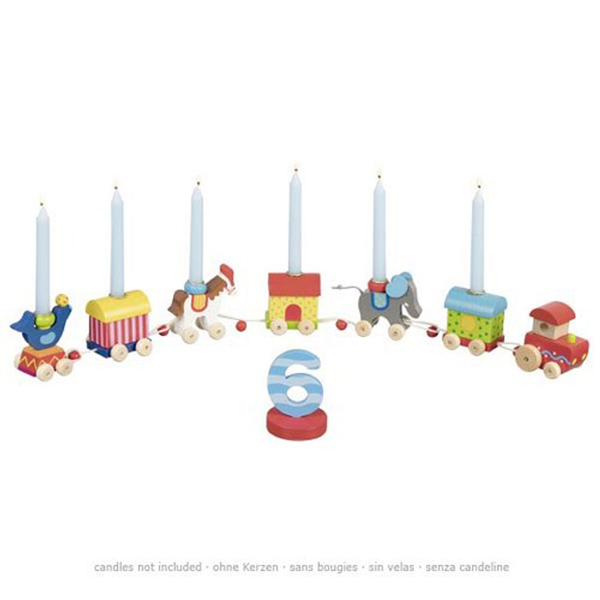 Mit dem Geburtstagszug von Goki wird jede Geburtstagsfeier zu einem besonderen Ereignis. Mit zahlreichen Geschenken beladen fährt der Zug zu deinem Geburtstag. Bunte Wagen und Tiere dienen als Geburtstagskerzenhalter. Während die Kerzen in Zahlenform (1 bis 6) schon im Lieferumfang enthalten sind können die restlichen Wagons noch zusätzlich mit den goki Geburtstagskerzen dekoriert werden.