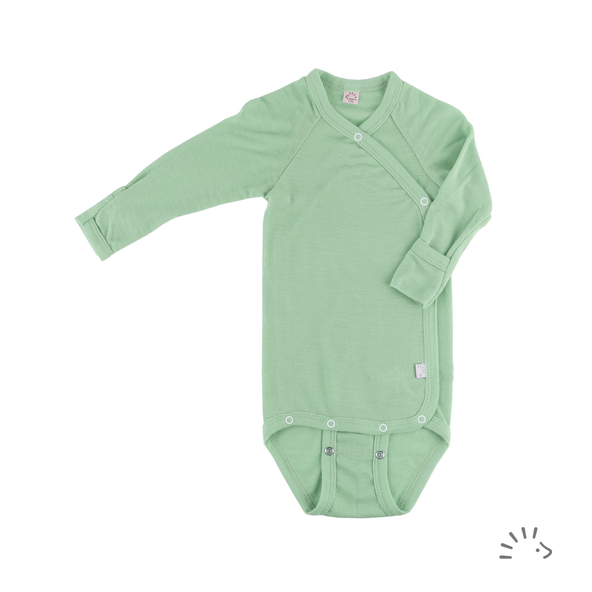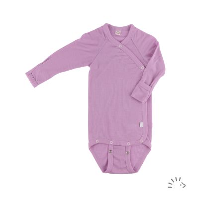 Die Ärmel des Wickelbodys aus Wolle-Seide lassen sich zum Schutz und Wärmen umstülpen. Seitlich angebrachte Druckknöpfe ermöglichen ein bequemes An- und Ausziehen, da dieser Body nicht über den Kopf gezogen werden muss. Durch die größenverstellbaren Druckknöpfe im Schritt ist der Body mitwachsend und optimal für Stoffwindelpopos geeignet. Das Feinrippmaterial bietet einen angenehmen Tragekomfort.