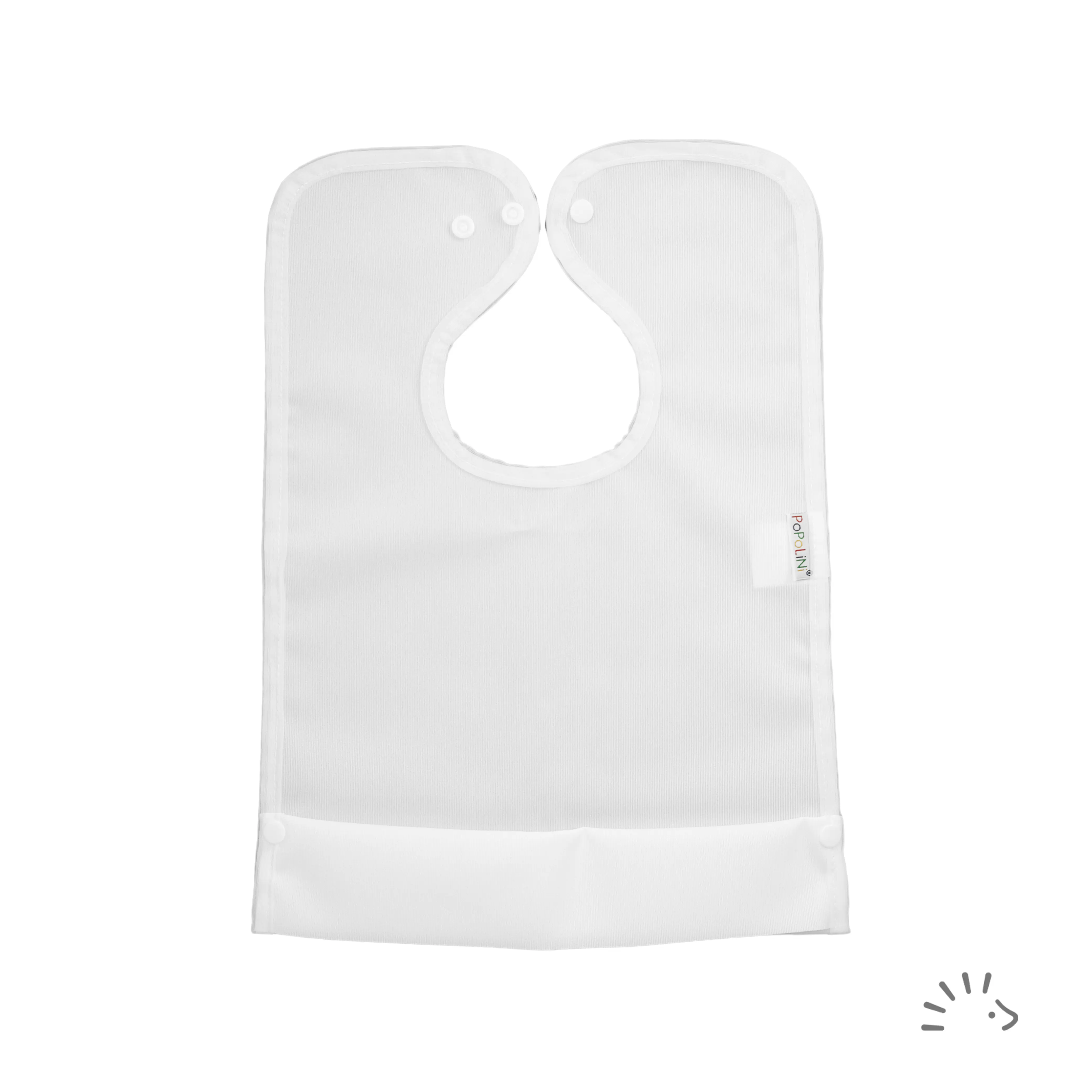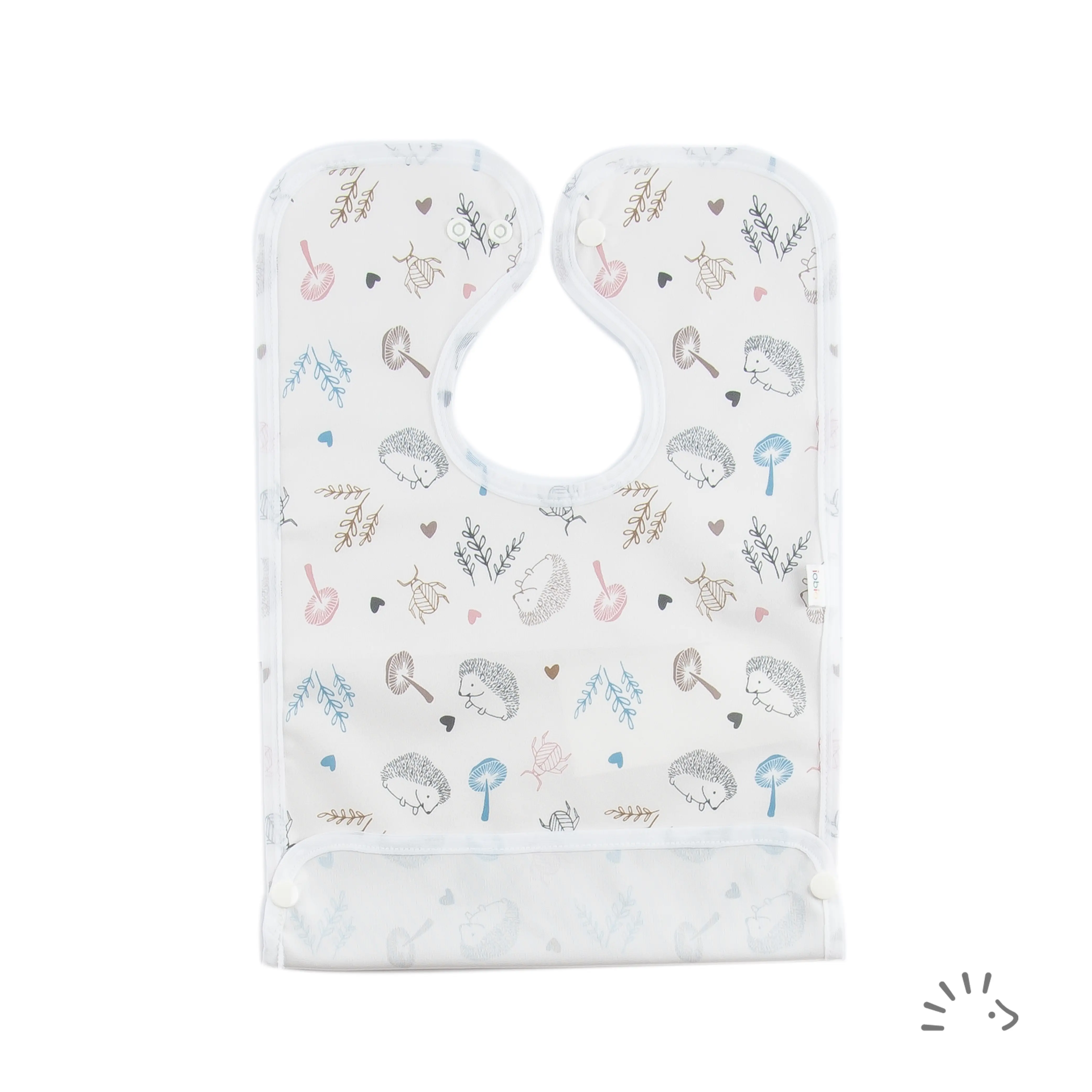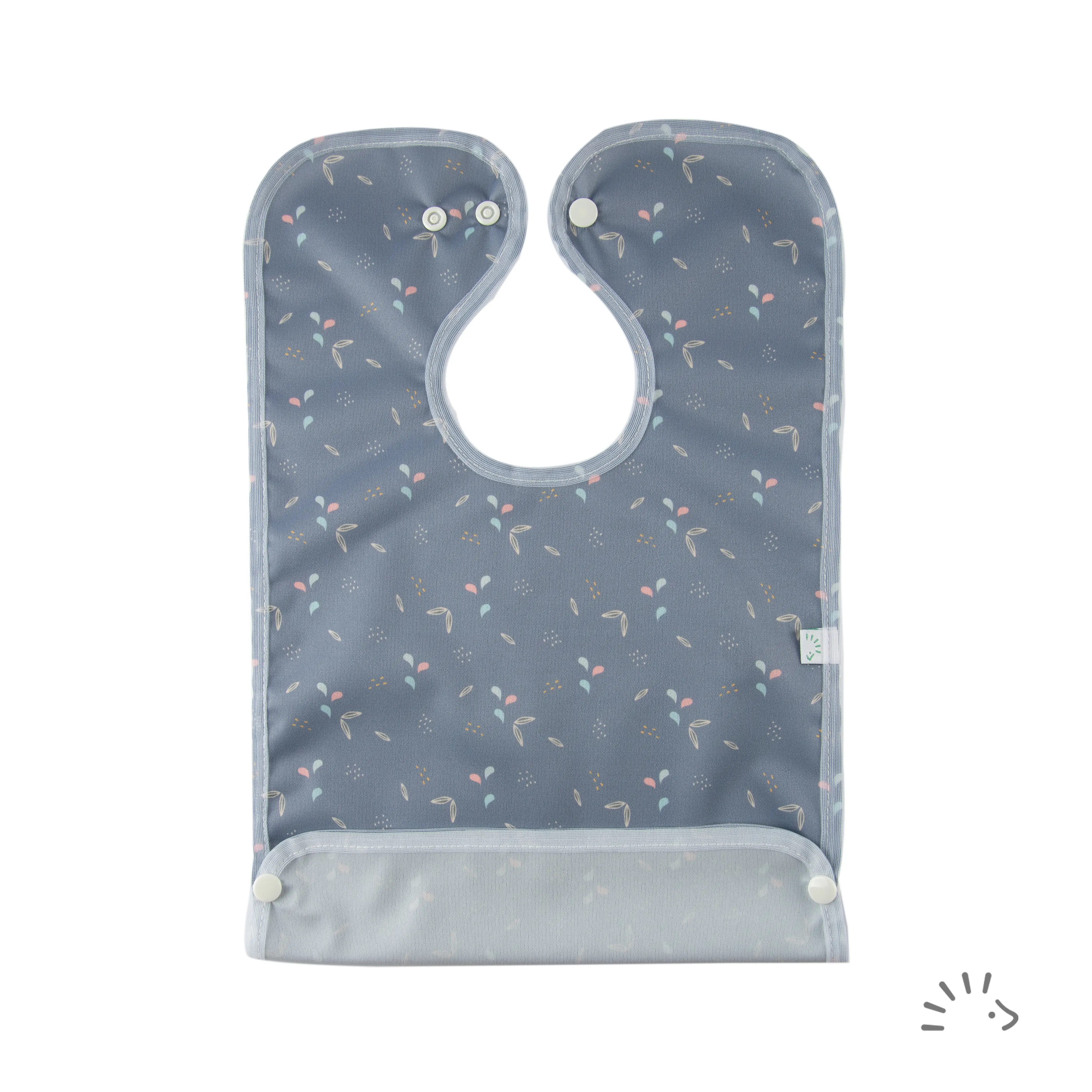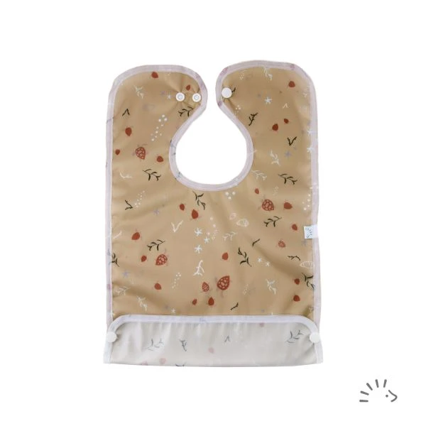 Das beschichtete, wasserfeste Lätzchen ist die ideale Wahl zum Essen lernen für Ihr Kind. Praktischen Schutz bietet die Auffangtasche, die mit seitlichen Druckknöpfen hochgeklappt und befestigt werden kann. Das Lätzchen wird durch Druckknöpfe geschlossen, ein zusätzlicher Druckknopf am Halsausschnitt ermöglicht die Größenverstellung.
