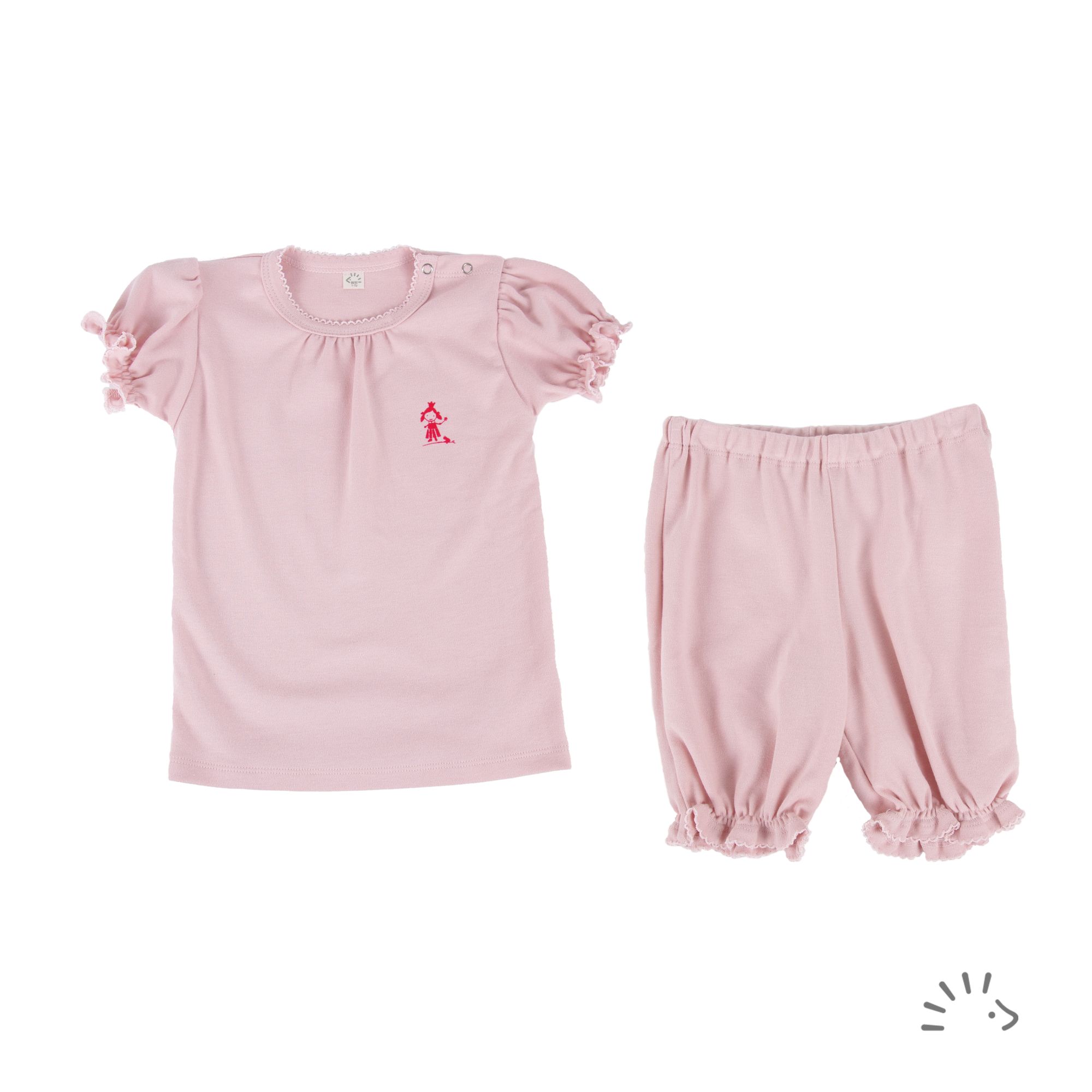 Der kurze Pyjama ist optimal für die warme Jahreszeit. Das zertifizierte Interlockmaterial sorgt für ein angenehmes Tragegefühl. Zwei seitlich angebrachte Druckknöpfe am Hals ermöglichen ein leichteres An- und Ausziehen. Mädchenhafte Puffärmel und Raffungen an Halsausschnitt und am Bein verleihen dem Pyjama seinen besonderen Charme. Der eingezogene Hosengummi am Bauch sorgt für einen optimalen Halt.