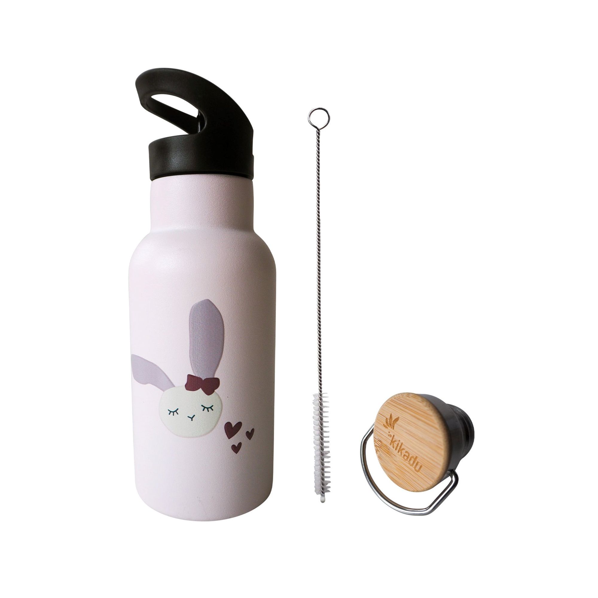 Die Trinkflasche von kikadu mit dem niedlichen Hasen Motiv, ist BPA-frei und eignet sich perfekt für den Kindergarten, die Schule oder große Abenteuer. Sie wird mit Schraubverschluss und Sportverschluss geliefert. Die doppelwandige, schadstofffreie Edelstahlflasche kann warme als auch kohlensäurefreie Getränke bis zu 12 Stunden warm bzw. kalt halten. Beigelegt ist eine Strohhalmbürste zur einfachen Reinigung des Sportverschlusses. Dank des klappbaren Metallbügels am neuen Sippy Cap stößt nichts mehr an die kleinen Stupsnasen und die Flasche kann trotzdem mit einem Karabinerhaken irgendwo befestigt werden.