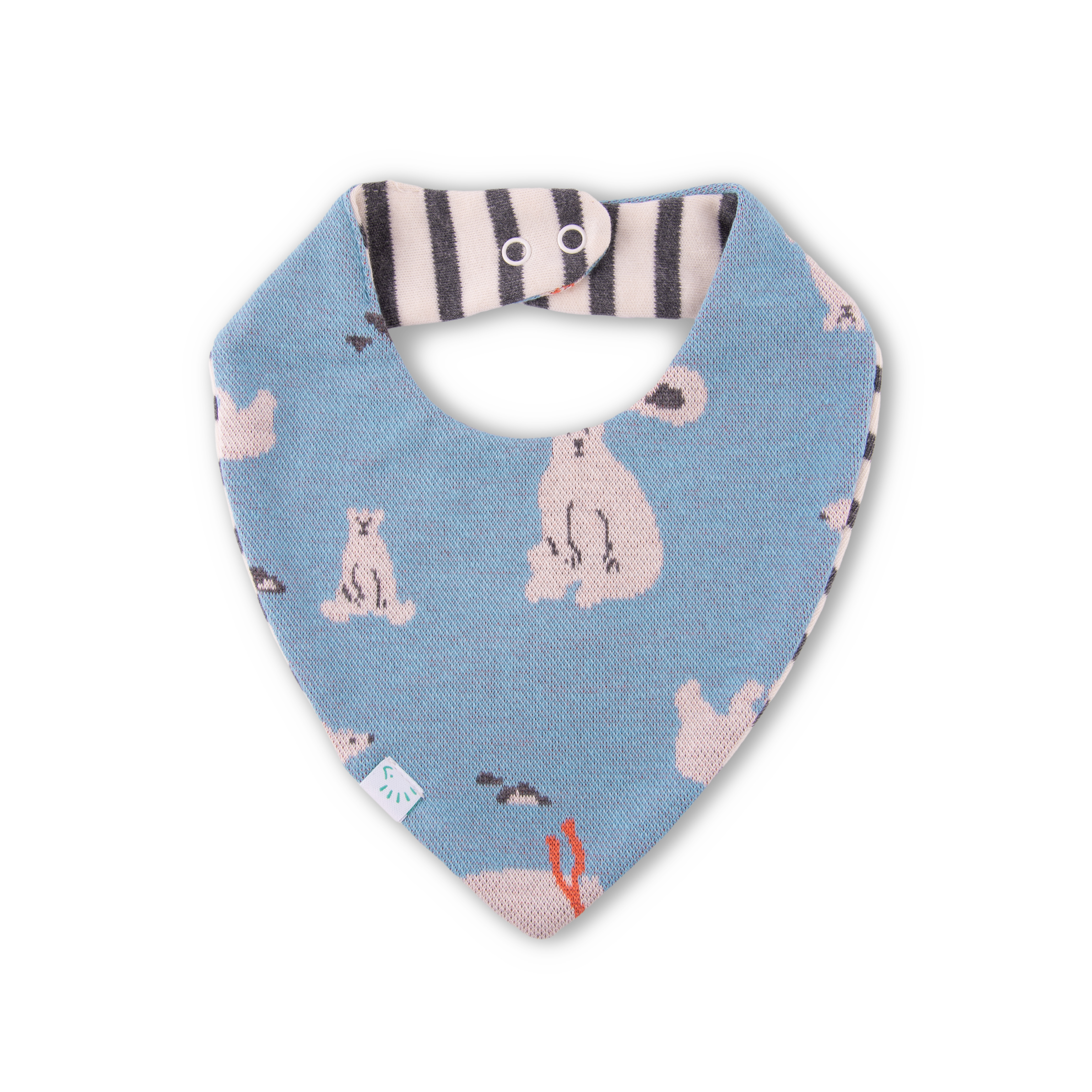 Das doppellagige Dreieckstuch ist das ideale Saugtuch während des Zahnens. Es ist wendbar und somit auf beiden Seiten mit verschiedenen Mustern zu tragen: mit liebevollem Eisbär-Motiv und Steifen Muster.
