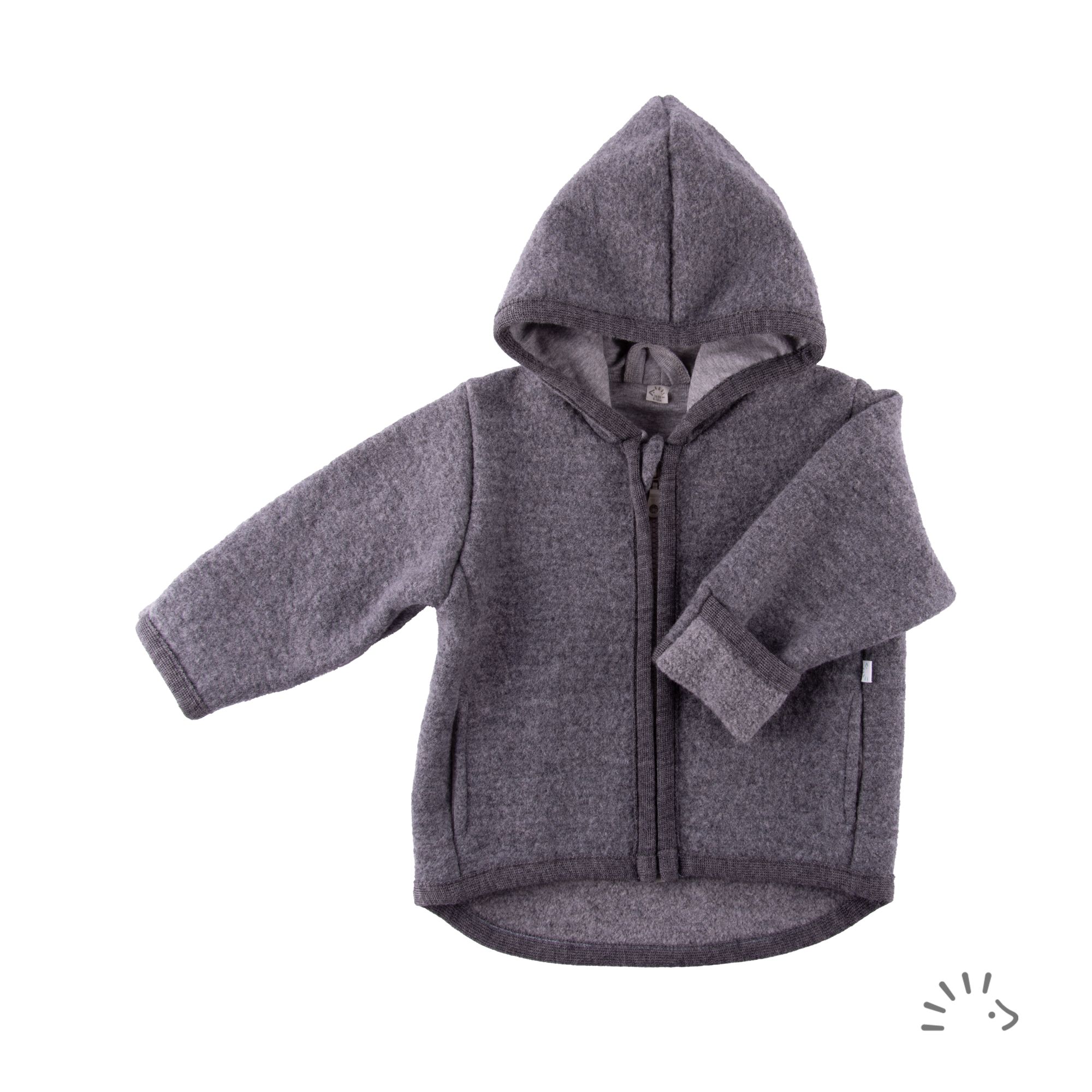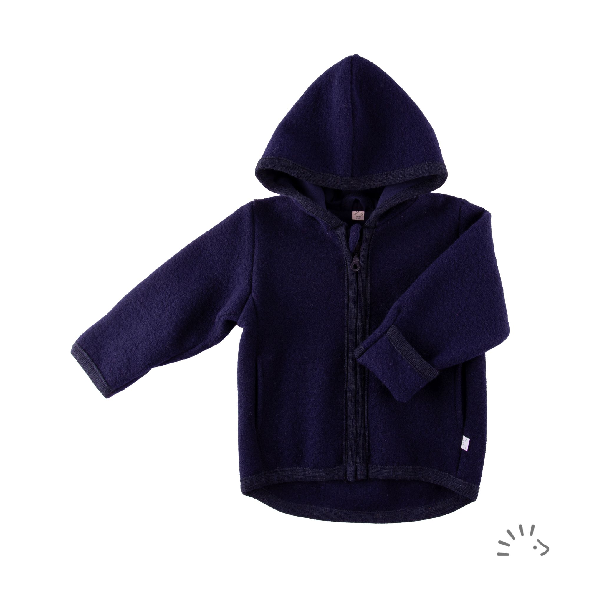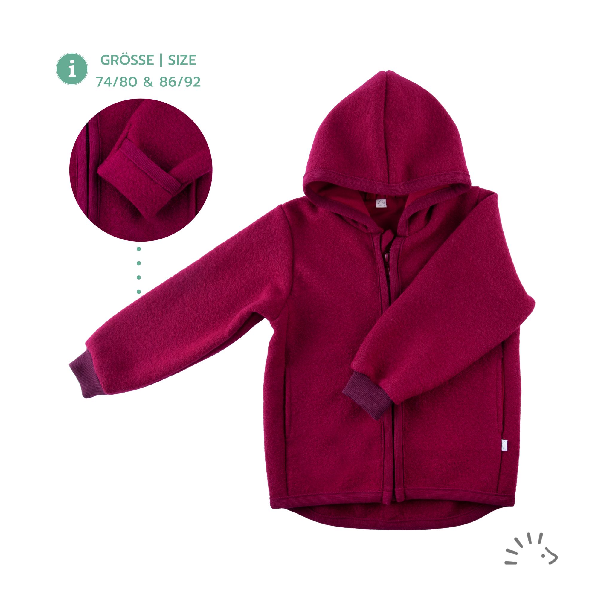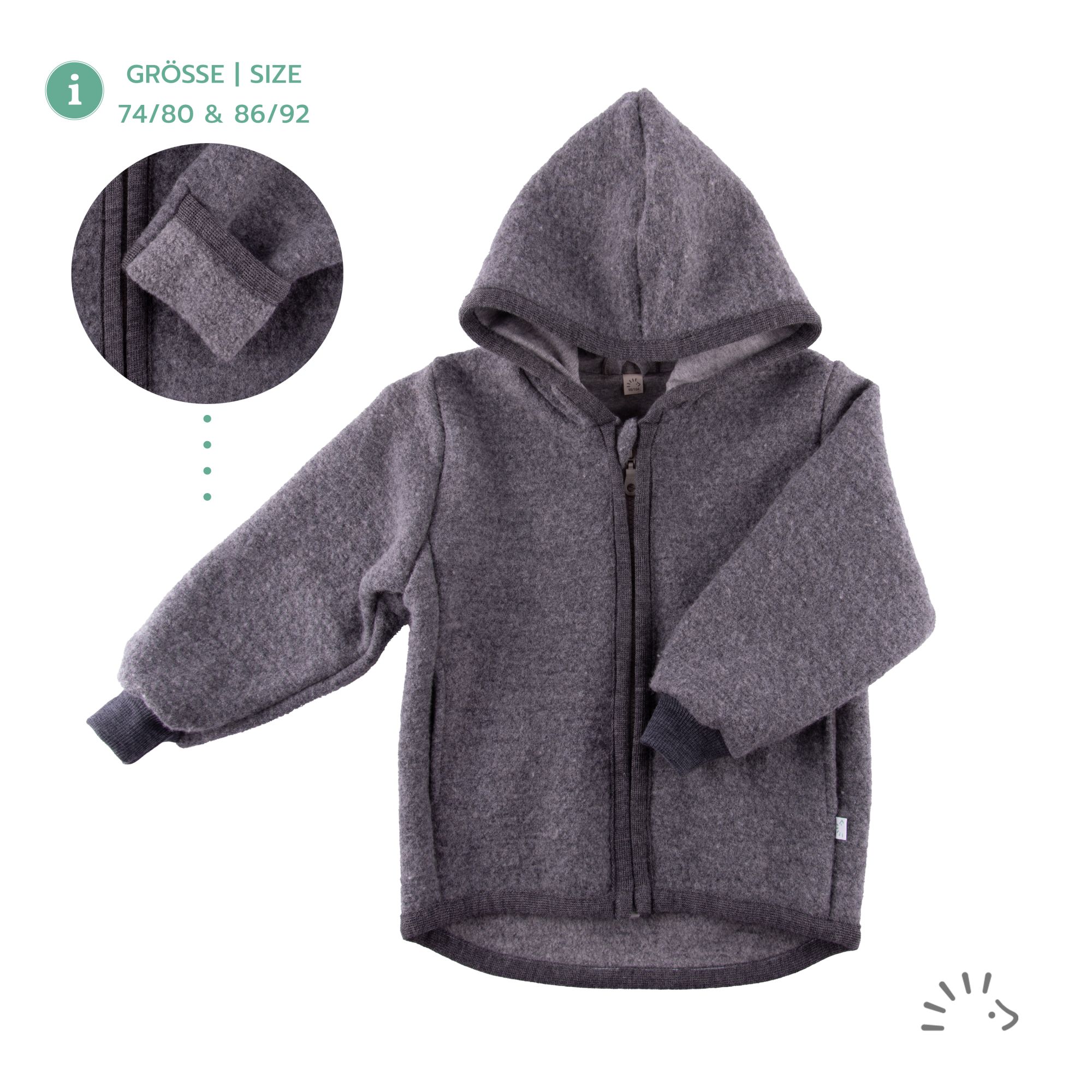Die Jacke aus Wollwalk eignet sich wunderbar für die kalte Jahreszeit. Schafwolle wird seit jeher für ihre natürliche thermoregulierende Wirkung geschätzt. Die Kapuze ist mit angenehmem Baumwoll-Interlock gefüttert. Praktische Taschen ermöglichen das Verstauen von kleinen Schätzen. Eine Schutzlasche am Hals sorgt für sicheres Schließen des Reißverschlusses ohne "zwicken". In den Größen 74/80 und 86/92 halten umklappbare Handschützer zusätzlich die Hände warm, ab Größe 98/104 schützt ein elastisches Wollbündchen vor Kälte und Nässe. Das Einfassband besteht aus reiner Wolle.