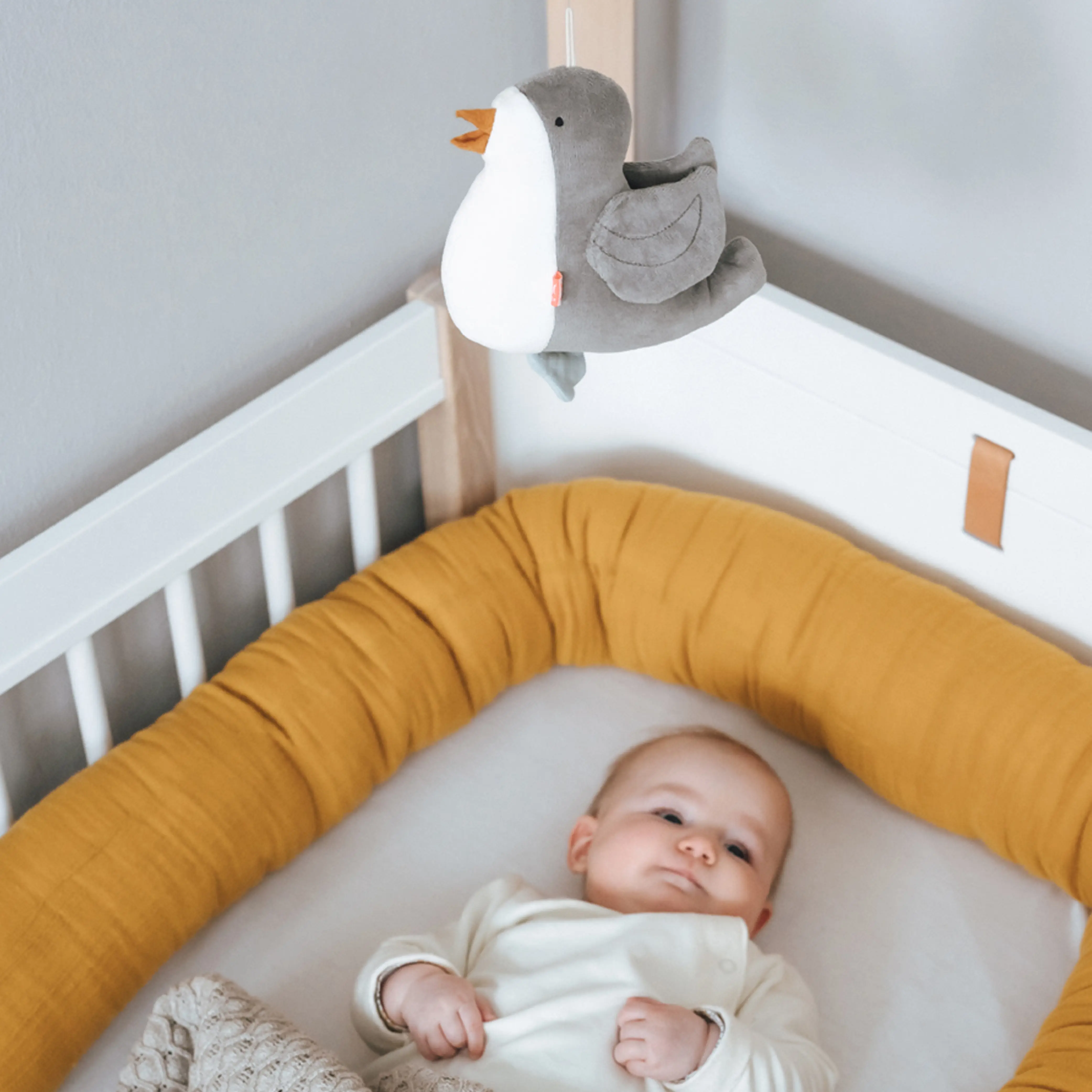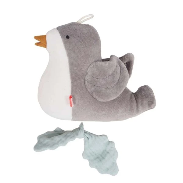Diese liebevoll gestaltete Spieluhr im Vogel-Design singt deinem Kind die beliebte Wiegenlied-Melodie von Brahms vor. Die süßen, grauen Flügel verleihen dem kleinen Waldvogel eine ganz persönliche Note. Die Schleife in Mint lässt sich auch für ganz kleine Kinderhände leicht aufziehen. Die Musikbox ist zum Waschen herausnehmbar.