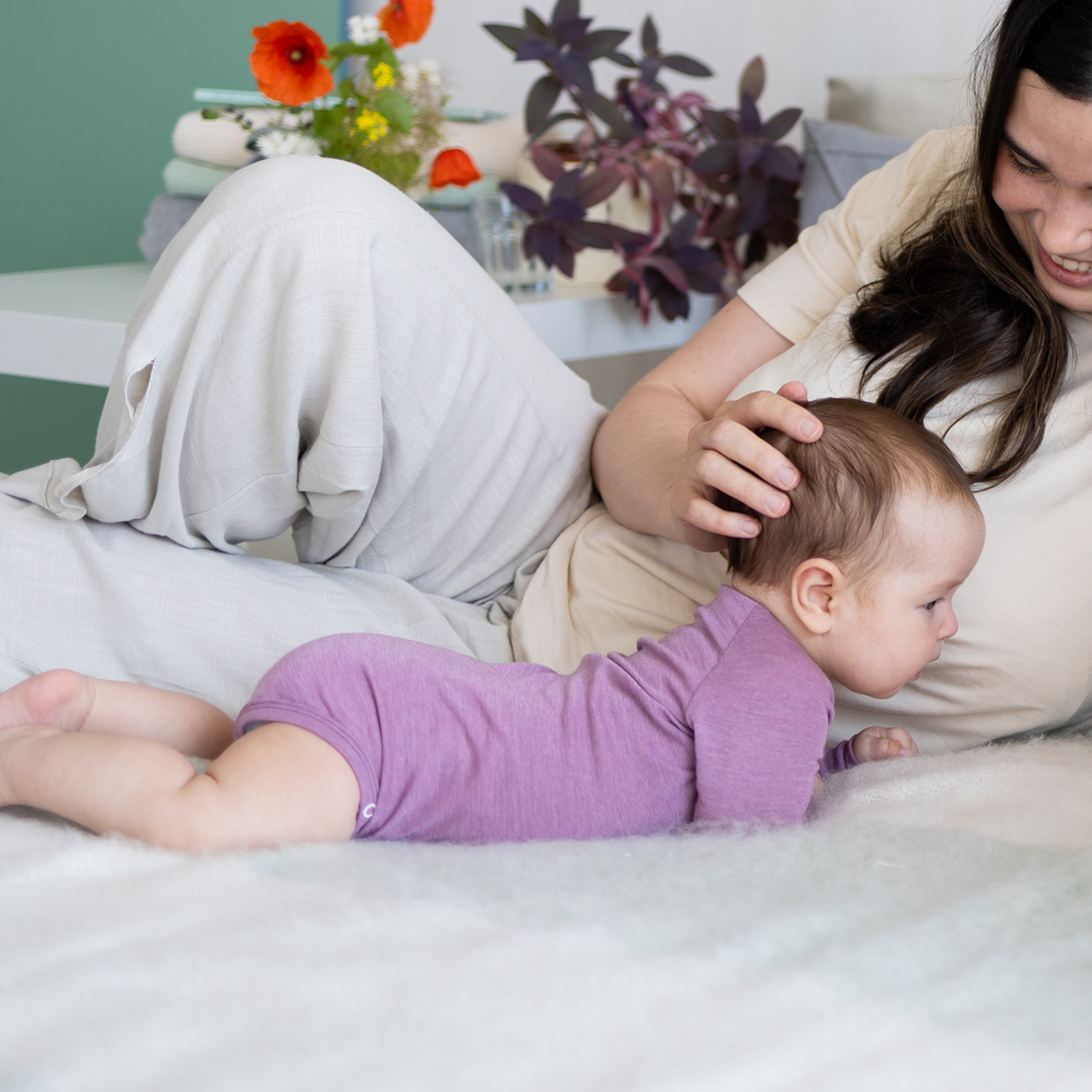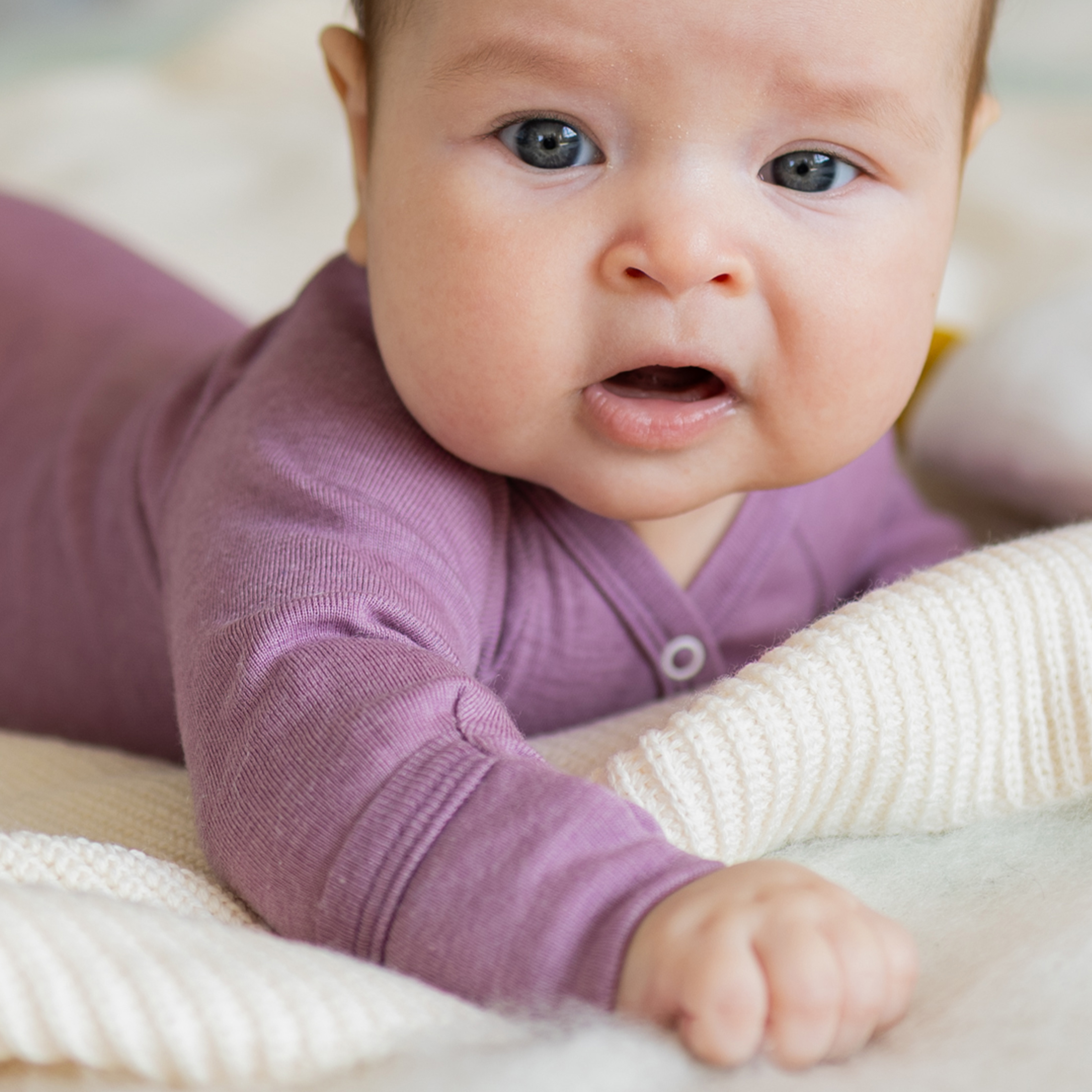 Die Ärmel des Wickelbodys aus Wolle-Seide lassen sich zum Schutz und Wärmen umstülpen. Seitlich angebrachte Druckknöpfe ermöglichen ein bequemes An- und Ausziehen, da dieser Body nicht über den Kopf gezogen werden muss. Durch die größenverstellbaren Druckknöpfe im Schritt ist der Body mitwachsend und optimal für Stoffwindelpopos geeignet. Das Feinrippmaterial bietet einen angenehmen Tragekomfort.