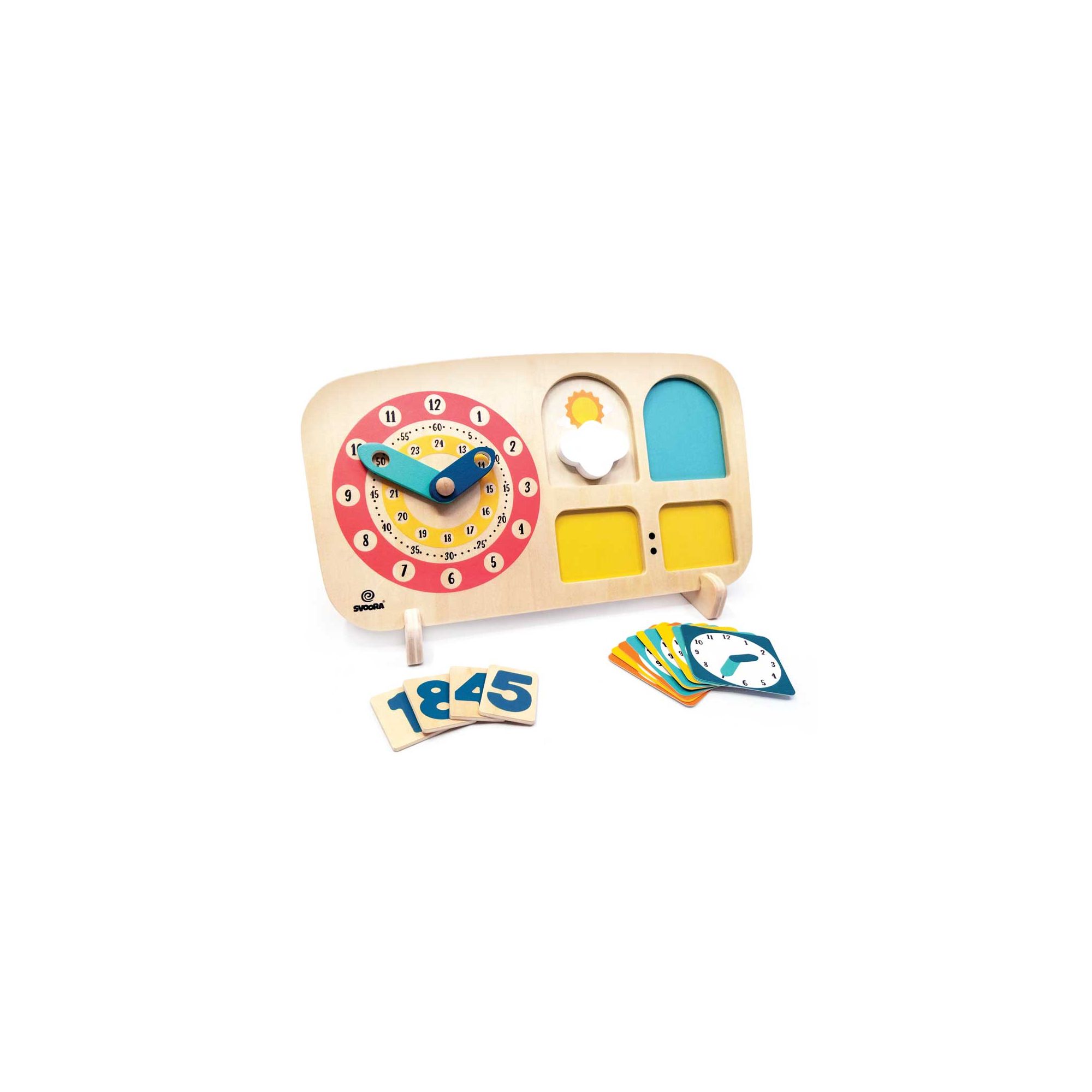 Das Spiel von dem Griechischen Hersteller Svoora ist sehr unterhaltsam und ein einfaches Lernspielzeug, mit dem Kinder nicht nur auf kreative Weise erstmals Kontakt mit der Zeit aufnehmen können sondern auch mit der englischen Sprache. Die „analoge“ Uhr mit den 2 Zeigern und 15 Zahlenplättchen für die „digitalen“ Zeitfenster zeigt Kindern, wie man die Uhr liest. Mit der rotierenden Wolke lernen sie Tag und Nacht zu unterscheiden und was AM und PM bedeutet. Die 24 Karteikarten stellen die Uhrzeit sowohl analog als auch digital dar und helfen durch ihre unterschiedlichen Farben bei der Unterscheidung der Tagesabschnitte. Das Spiel ist ausschließlich aus Buchenholz und Sperrholz gefertigt und hat abgerundete Ecken damit es ungefährlich für die Kleinen ist.