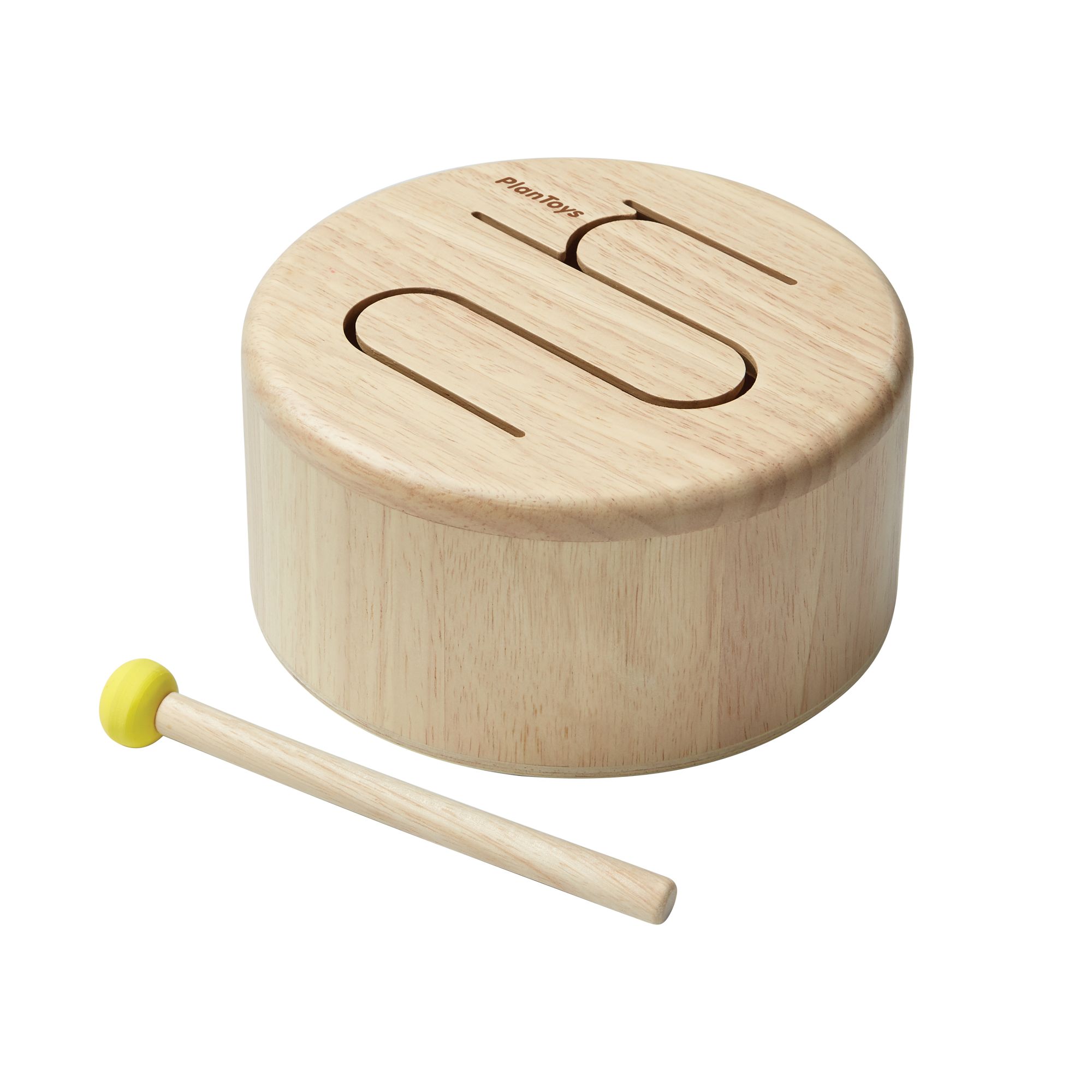 Diese Holztrommel von PlanToys hat eine geschwungene Form und eine kompakte Größe, sodass die Kleinen das Spielzeug leicht greifen und Musik machen können. Ein Gummikopf-Trommelstock mildert die Schläge auf die Trommel und die Lautstärke.