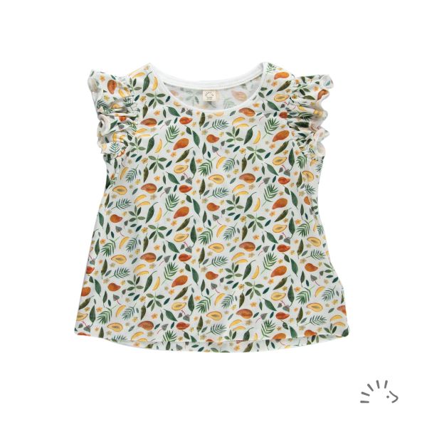 Das Shirt ist aus feinem Baumwoll-Single Jersey gefertigt, der sich besonders für heiße Temperaturen toll eignet. Charmanter Rüschen-Look am Armloch und leichte A-Linie. Der Praktische Druckknopfverschluss an der Schulter ermöglicht einfaches An- und Ausziehen.