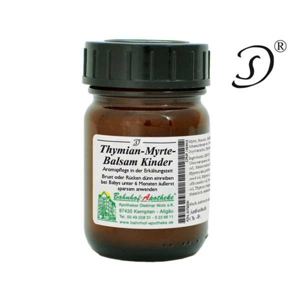 Der Thymian-Myrte-Balsam aus der Bahnhof-Apotheke für Kinder ist zur Aromapflege in der Erkältungszeit, einfach auf Brust oder Rücken dünn einreiben. Die wohltuende Aromamischung pflegt die Haut und wird vom Organismus über Atmung und Haut aufgenommen, regt das tiefe Durchatmen und die Durchblutung an.