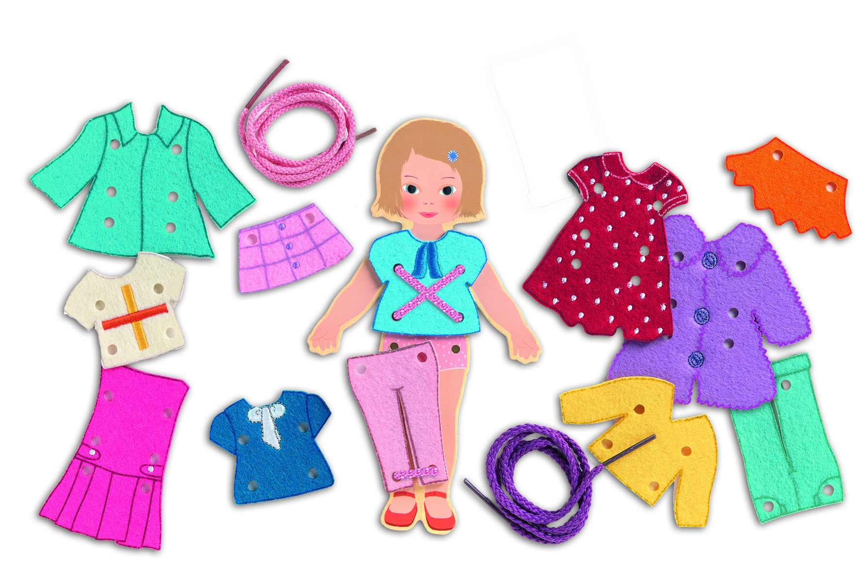 12 pieces of clothing made of felt, 1 lace doll and two strings.