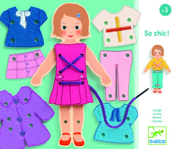 With this threading game, cute outfits can be attached to a wooden doll. This educational game promotes hand-eye coordination and children's creativity.