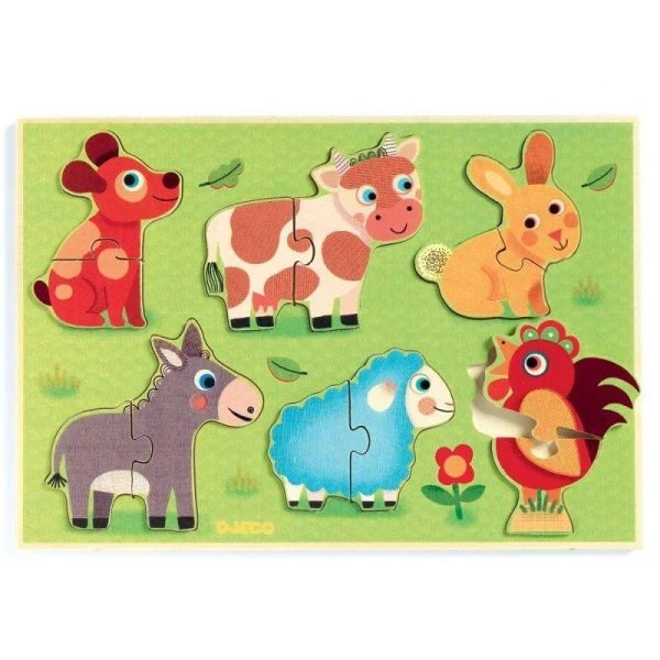 The puzzle shows 6 animals, each composed of 2 parts. Can you find the right shapes and put the dog, cow, rabbit, donkey, sheep and rooster on the meadow? Promotes motor skills and an understanding of shape and color.