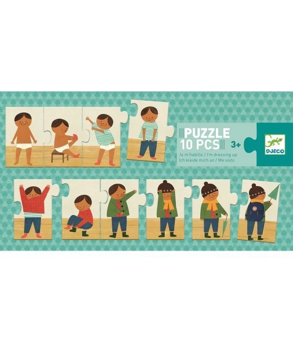 The puzzle playfully depicts the process of getting dressed. From the underpants to socks, T-shirt and pants to the fully dressed child. An educational puzzle for kindergarten children.