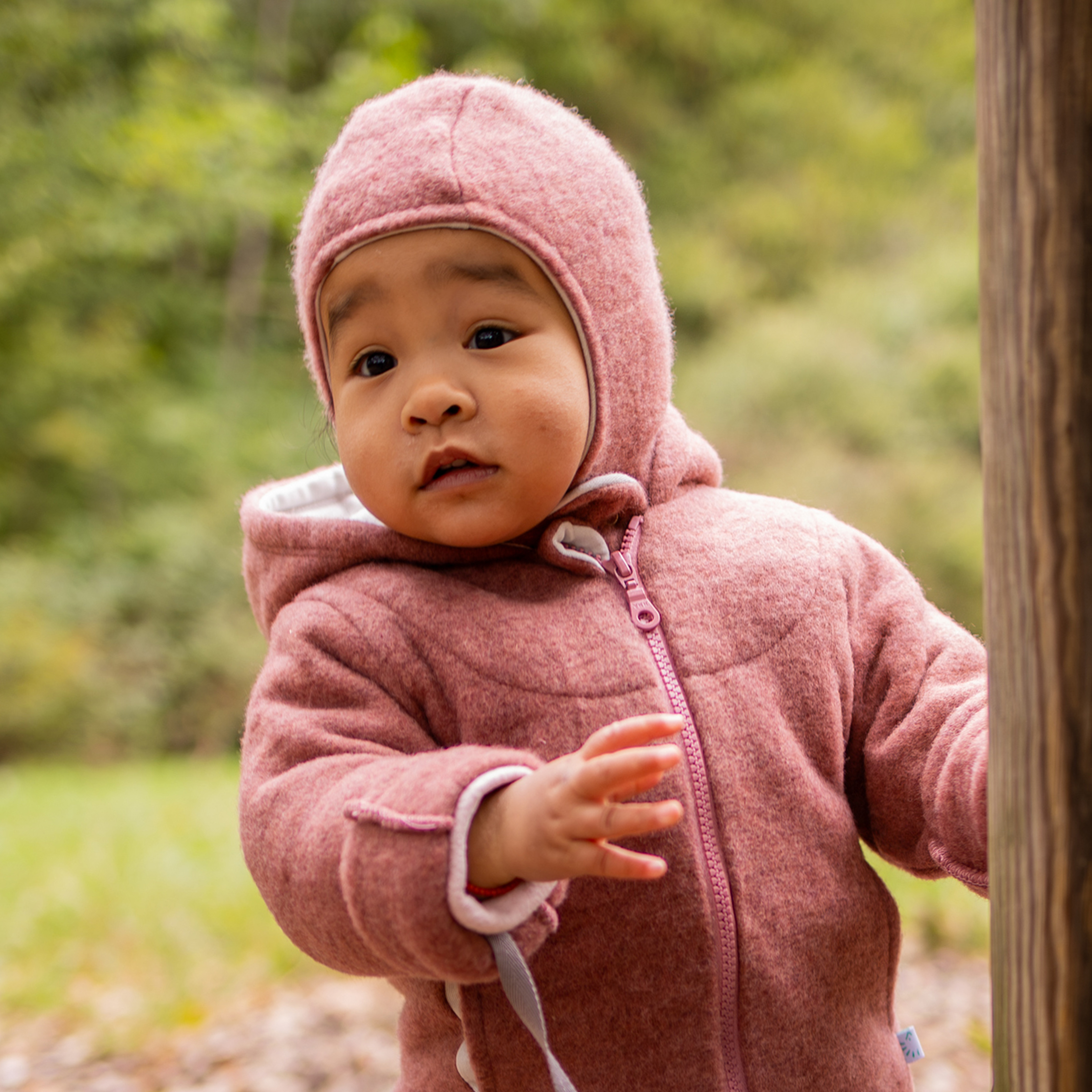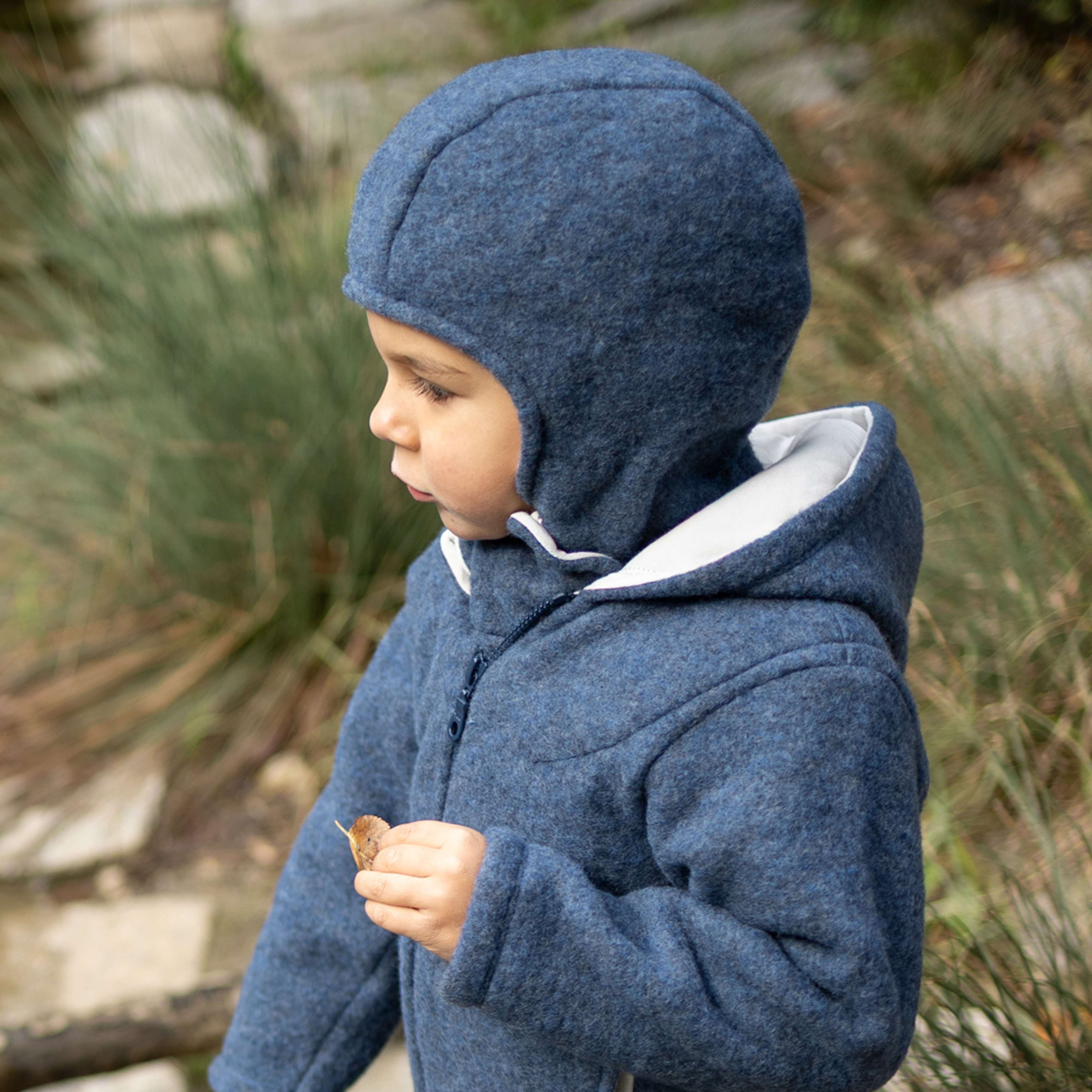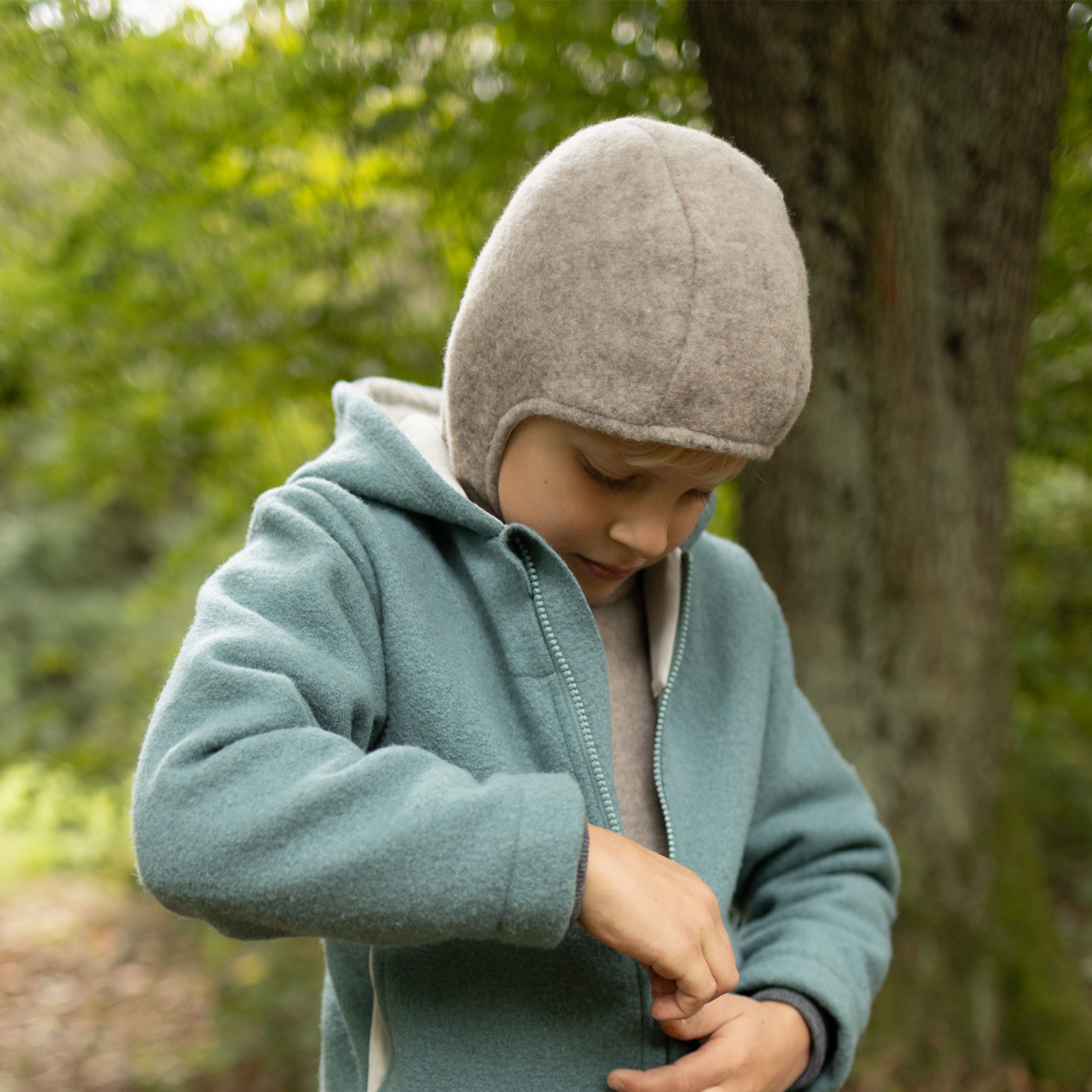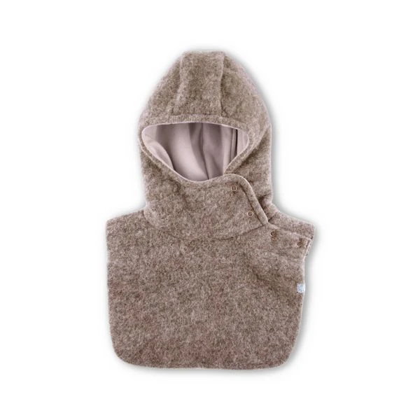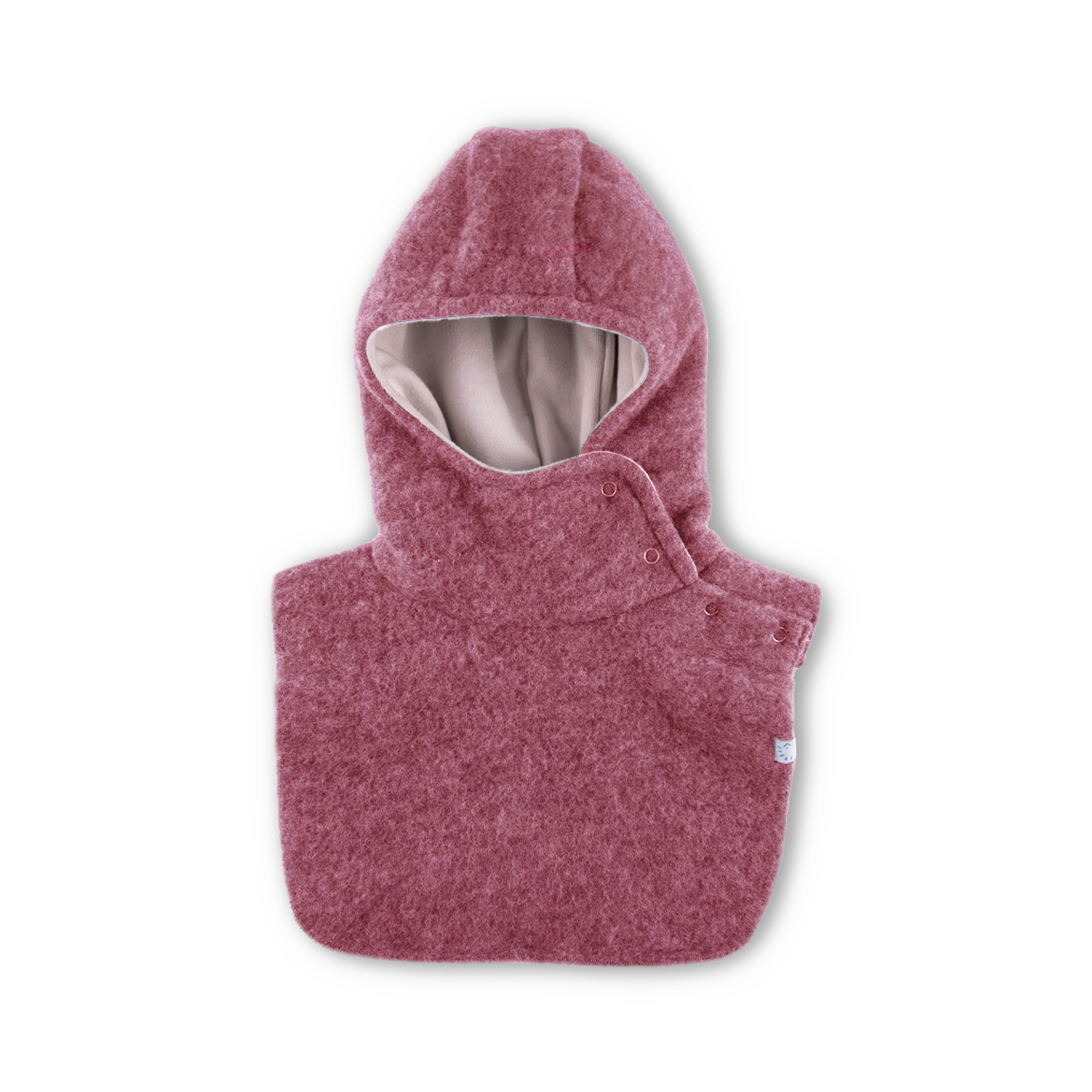 Warming wool on the outside, lined with smooth organic cotton jersey on the inside, prevents from itching and protects against wind and weather. The item can be easily pulled over the head or opened with the snap fastener. No annoying "pulling over your head" is necessary!