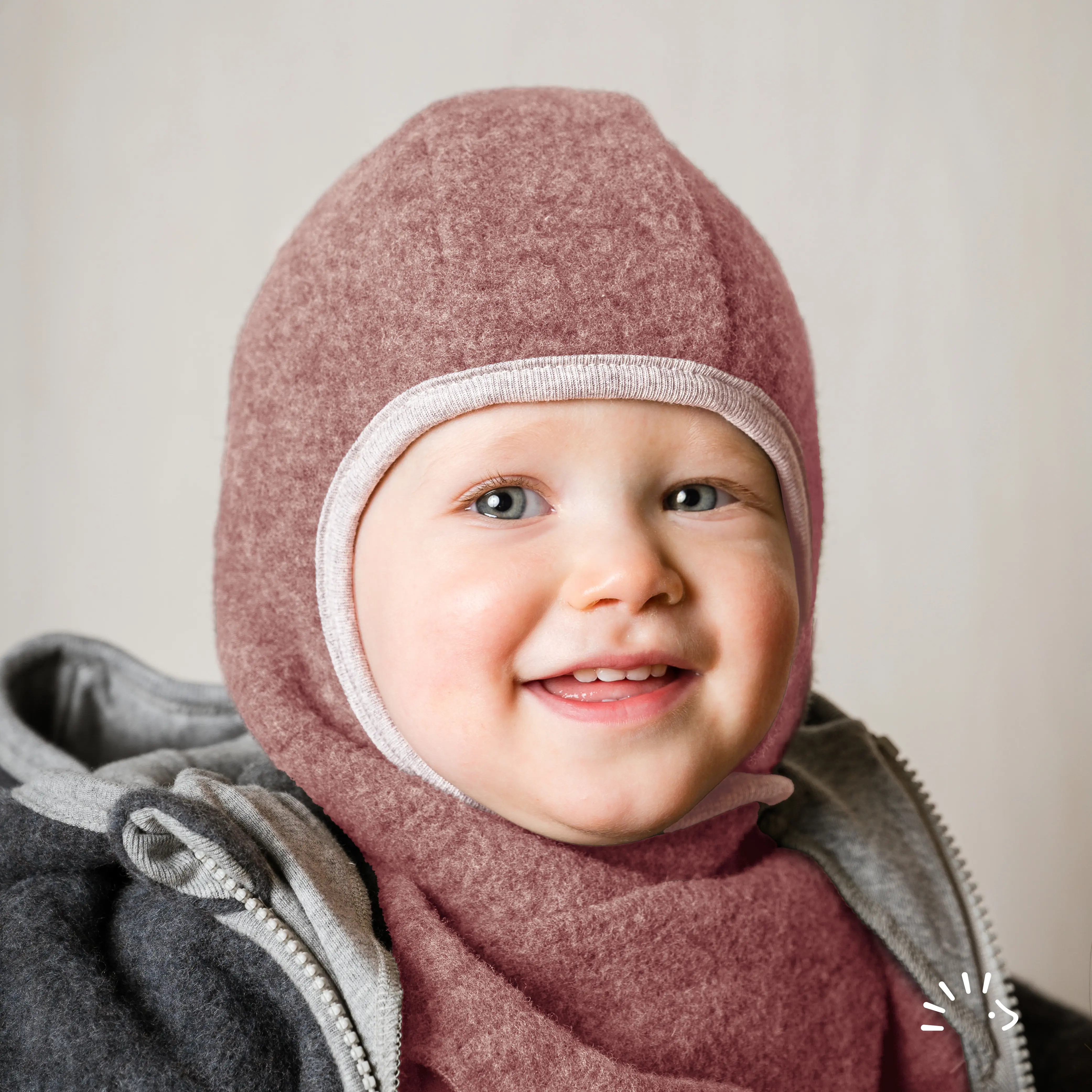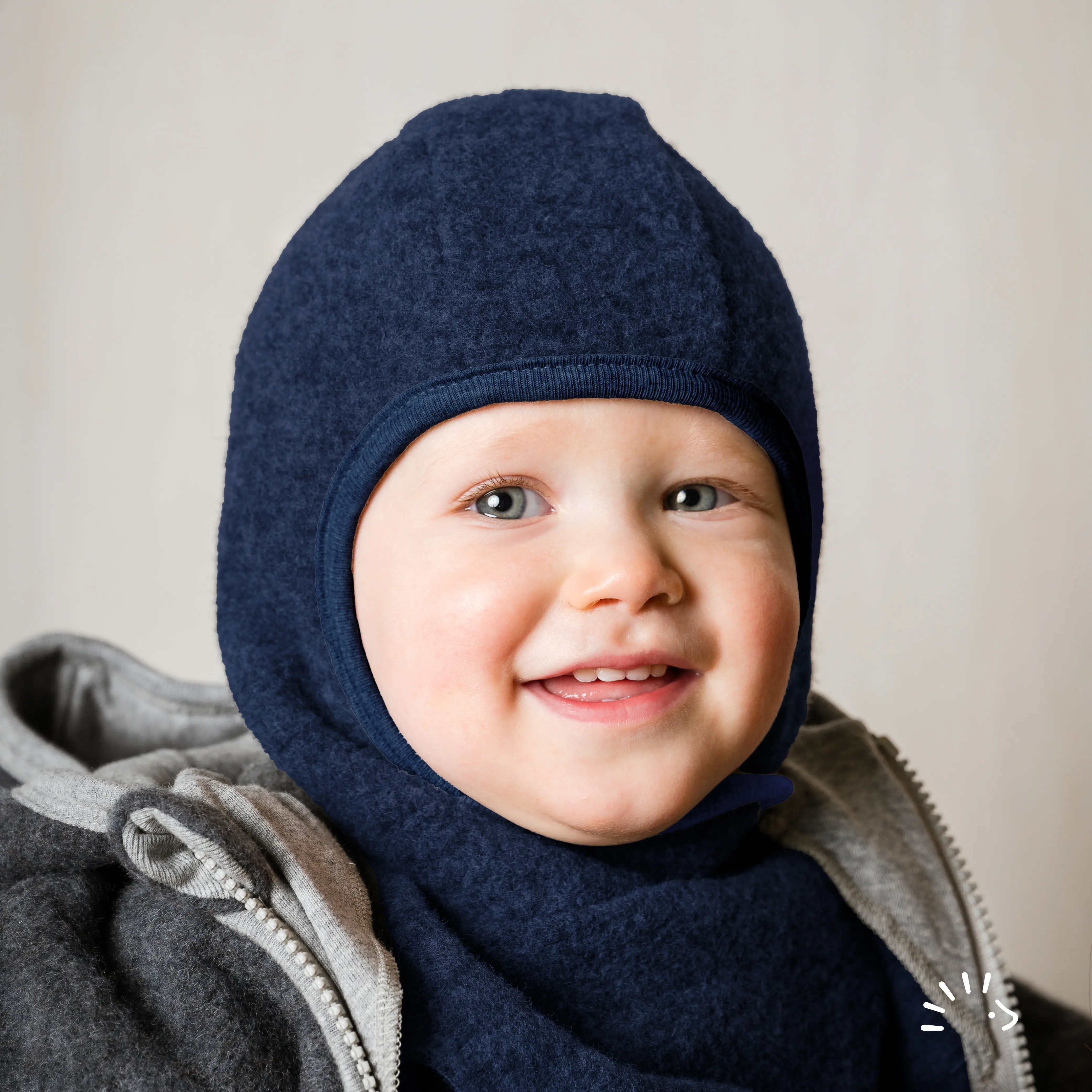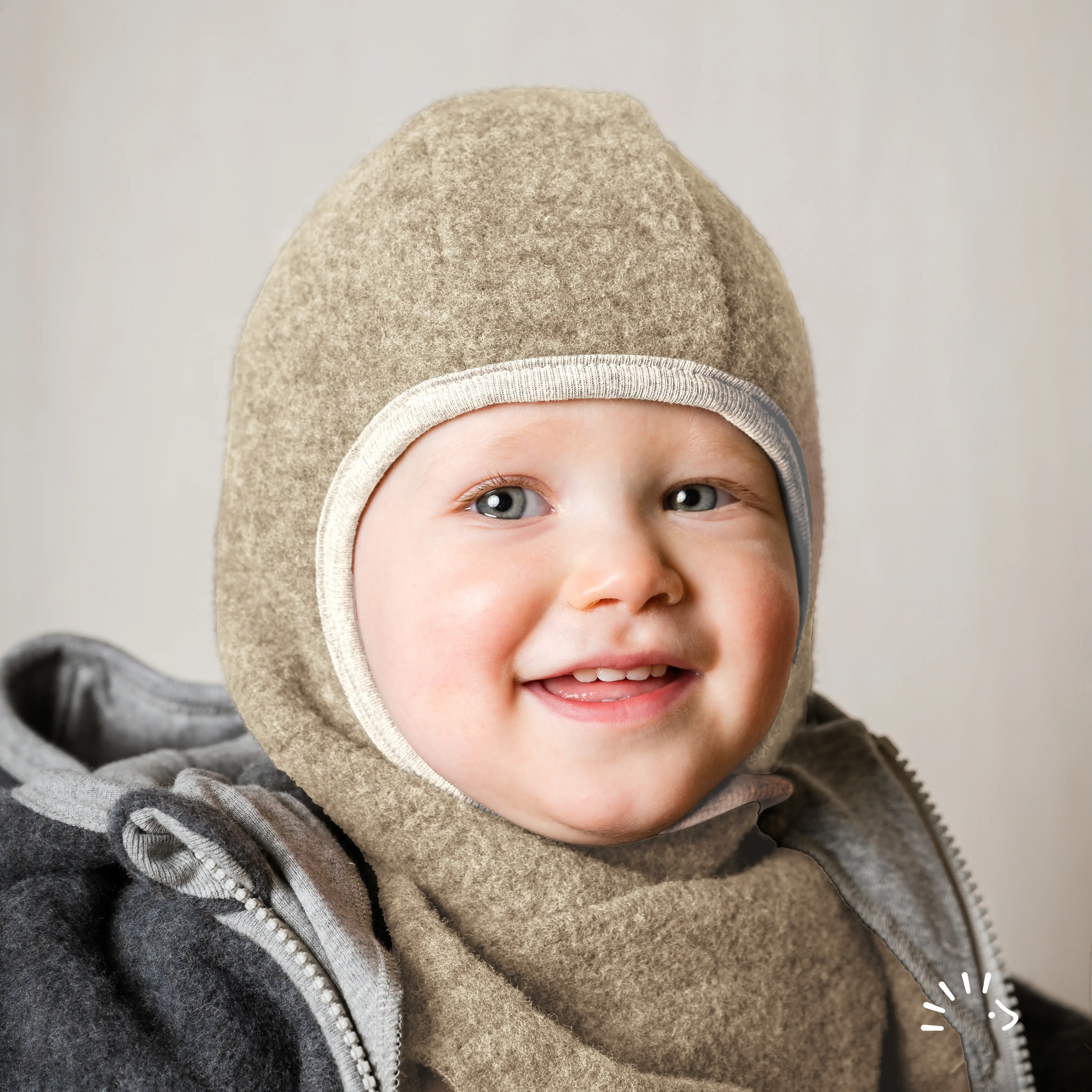 The practical Balaclava made of organic merino wool fleece naturally protects against wind and cold in the cold season. The human body loses about 30% of body heat through the head, so it is particularly important to protect babies and small children well. Sheep's wool has always been valued for its natural thermoregulating effect. Our wool fleece is manufactured according to the GOTS guidelines, which guarantees fair, low-emission production and animal welfare. Warming wool on the outside, lined with smooth organic cotton jersey on the inside, prevents from itching and protects against wind and weather. The item can be easily pulled over the head or opened with the snap fastener. No annoying "pulling over your head" is necessary!