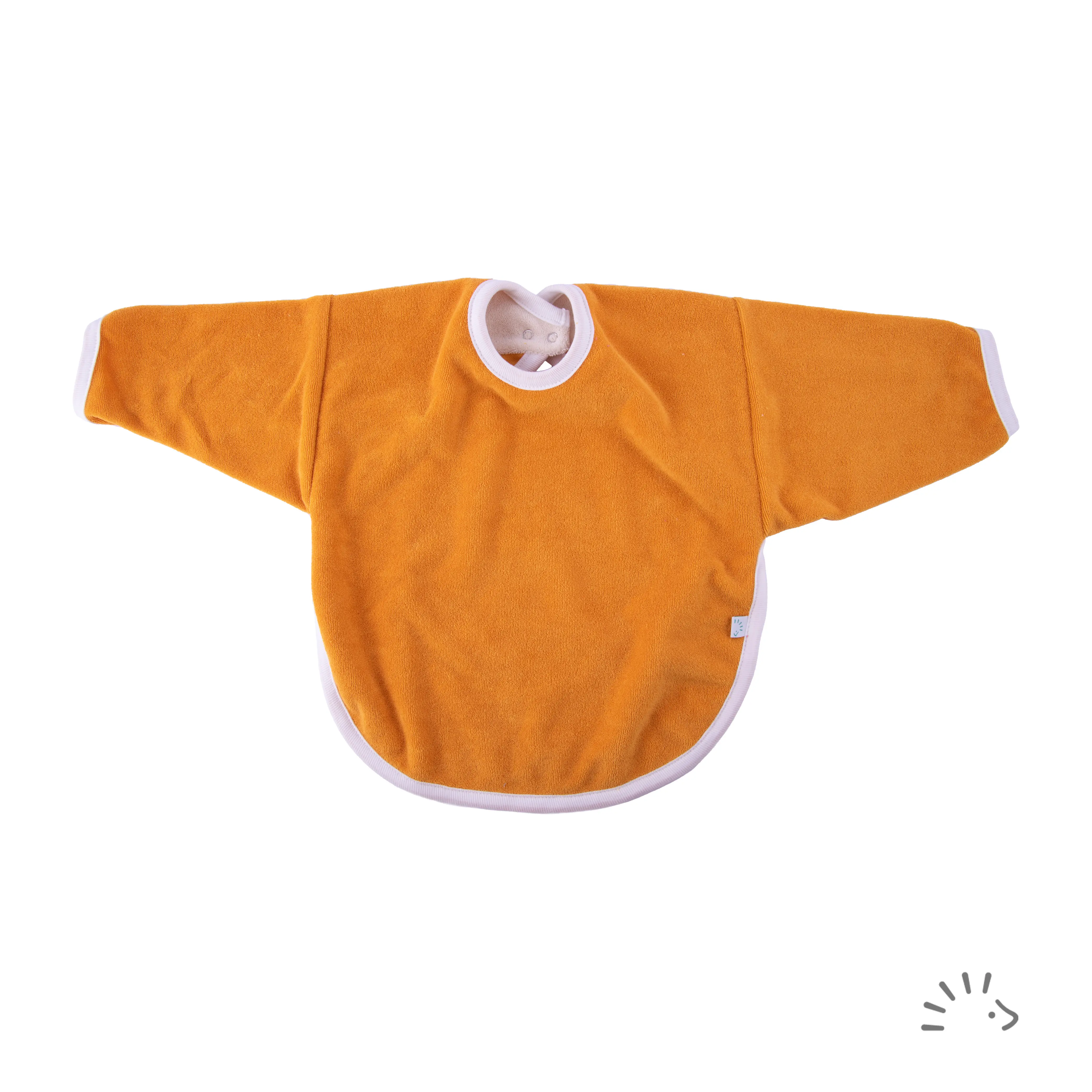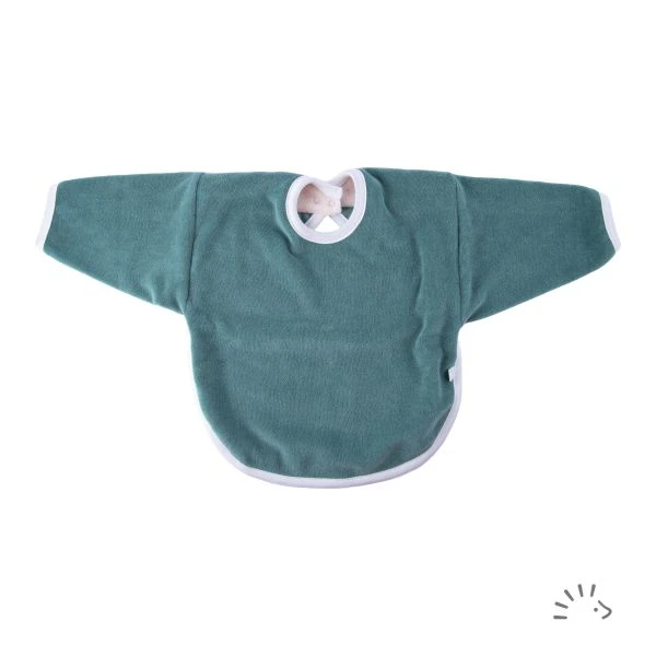 Our double-layered long sleeve bib made from cotton terry is the ideal choice for eating. The bib can be close by a push button, a further push button on the neck allows size-adjustment.