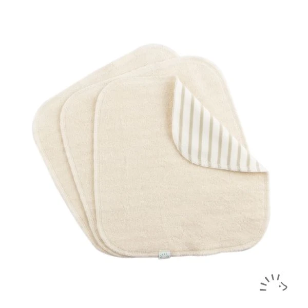 The washable double-layer cleaning wipes made of GOTS certified cotton are available in the practical 3-piece pack. Organic cotton terry on one side, soft cotton jersey on the other.