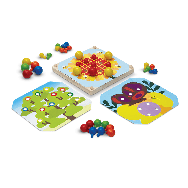 Follow the patterns or create your own masterpiece on the pegboard. The set includes a wooden board, 3 doublesides cards with 6 different scenes and 50 colored pencils in 2 different sizes.