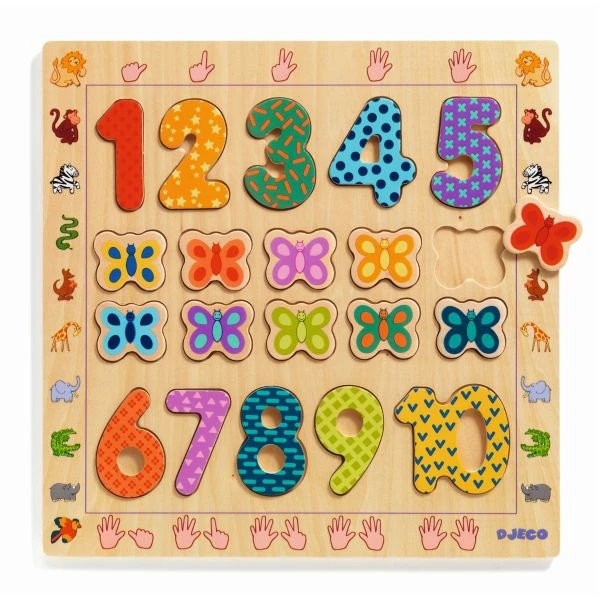 Great number puzzle made of wood by DJECO. In this way, your child will become familiar with the numbers from 1 to 10 in a playful way. The puzzle pieces in the form of numbers and butterflies can be assigned to the appropriate shapes. The corresponding number of cute animal symbols are hidden on the back of each number. A versatile game for children.
