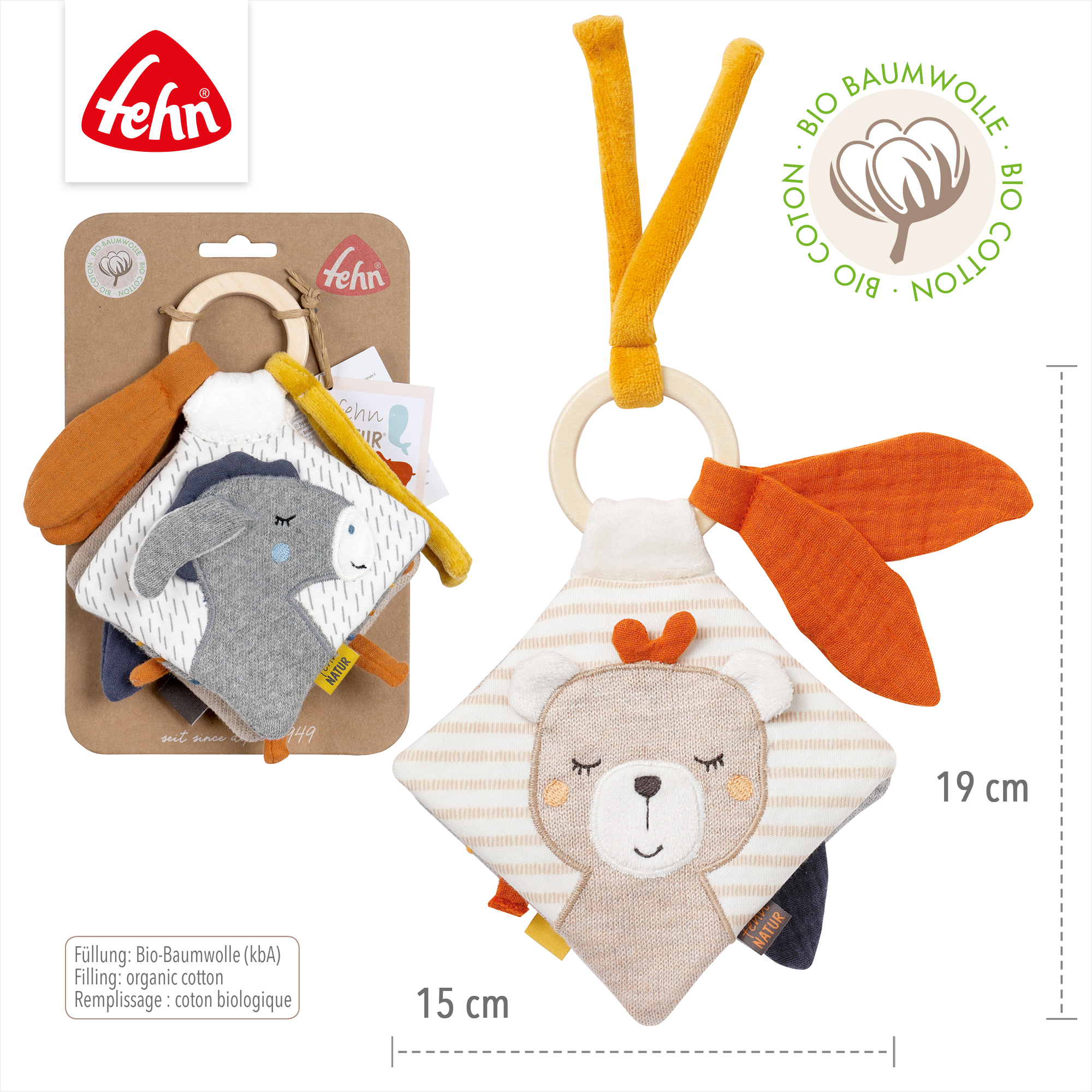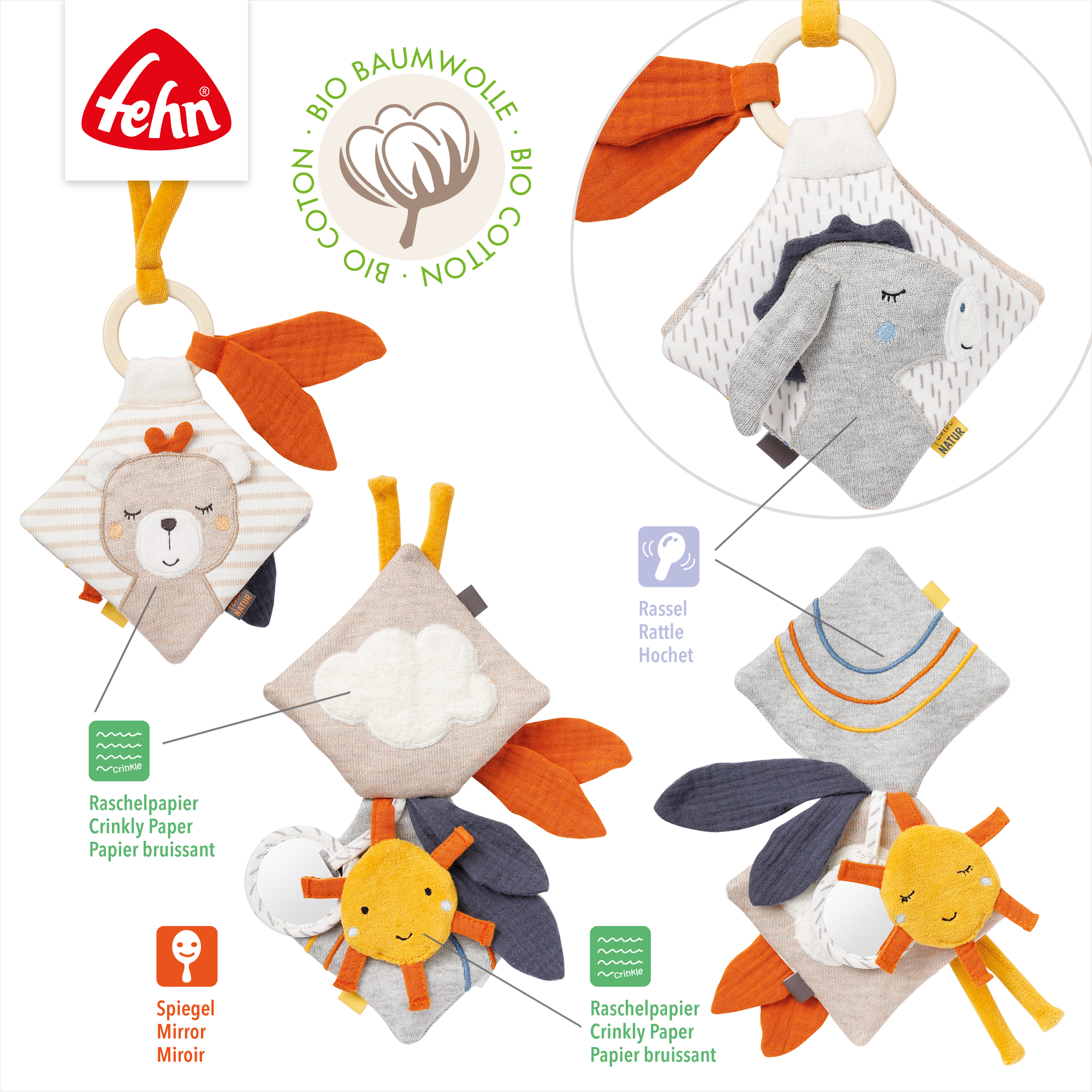The fabric book donkey has an unusual shape but is still easy to leaf through and discover. The activity baby book can be easily held by babies on the wooden ring while they explore the book; it rustles, rattles and crackles. The light reflections of the mirror and the sun with two faces will fascinate your child.