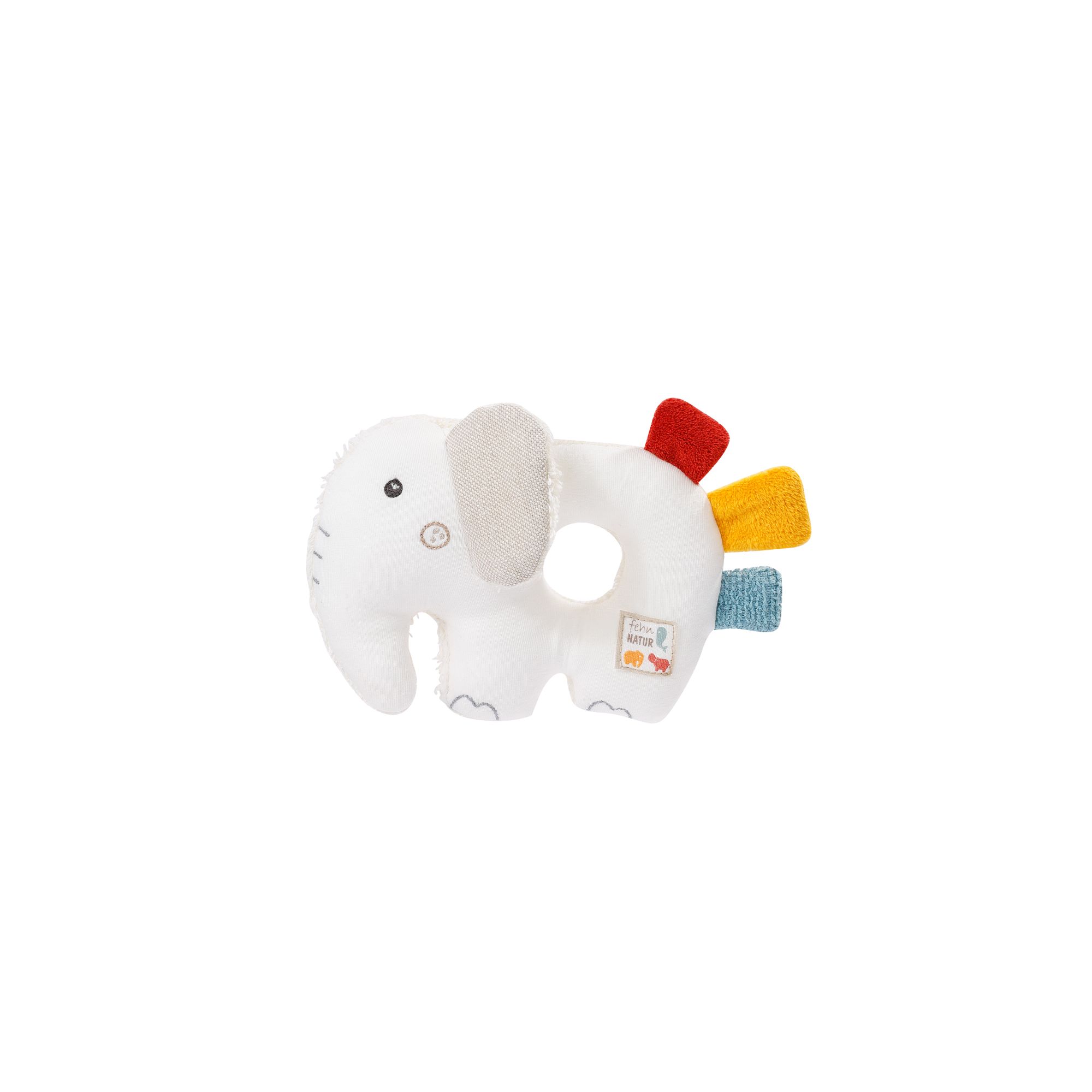 The elephant grasping toy from fehnNatur with outer materials in different structures and soft filling made of organic cotton is easy for small baby hands to grasp. Integrated rustling paper and a rattle motivate you to shake and grab and thus promote motor skills.