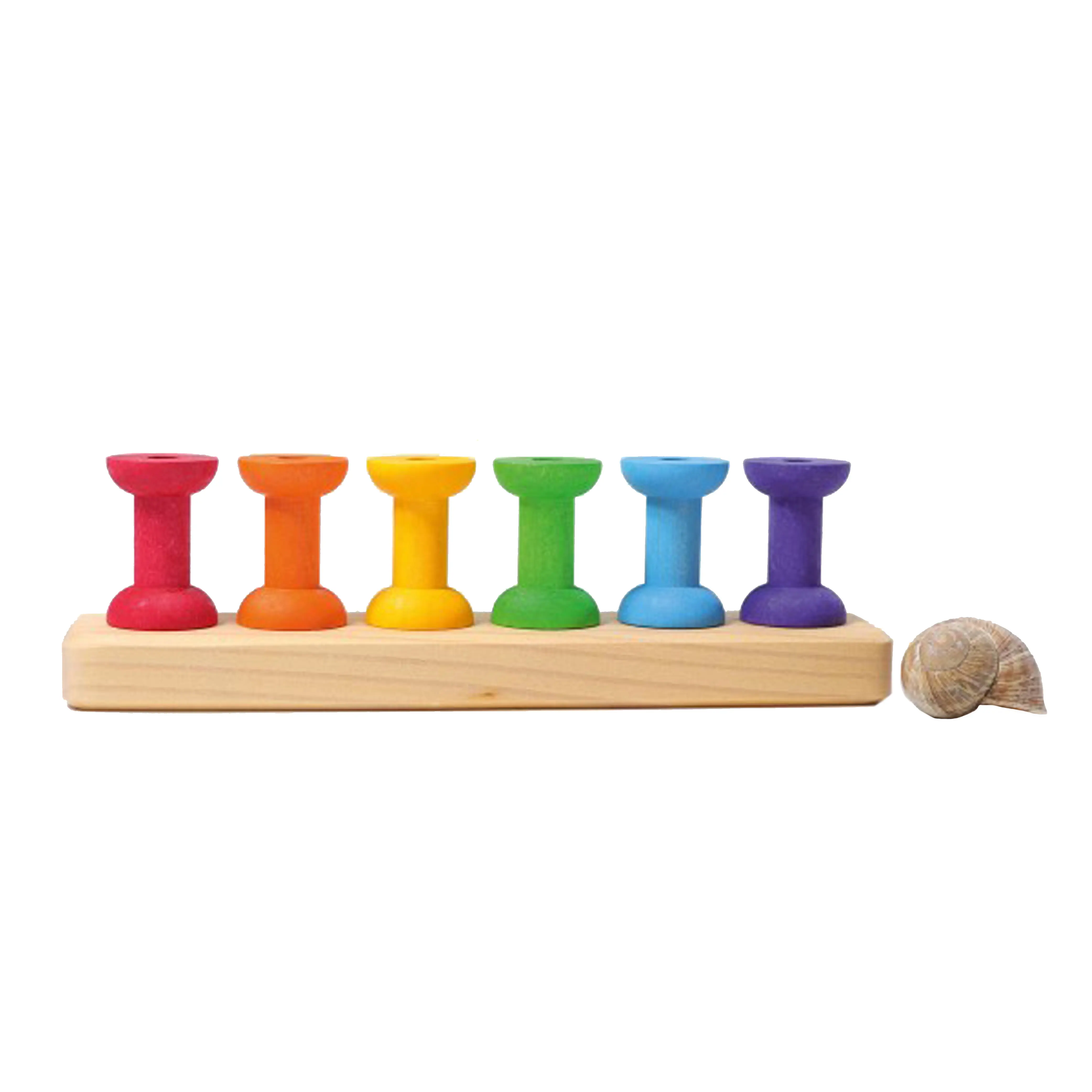 The threading game with small wooden spools from GRIMM'S offers a variety of fun. At the beginning it is plugged in and later the threading can be practiced. A wonderful game for learning colors.