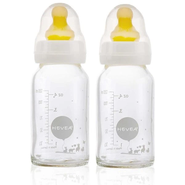 2-pack HEVEA Glass baby bottle white with Natural Rubber Nipple, No harmful leaching.