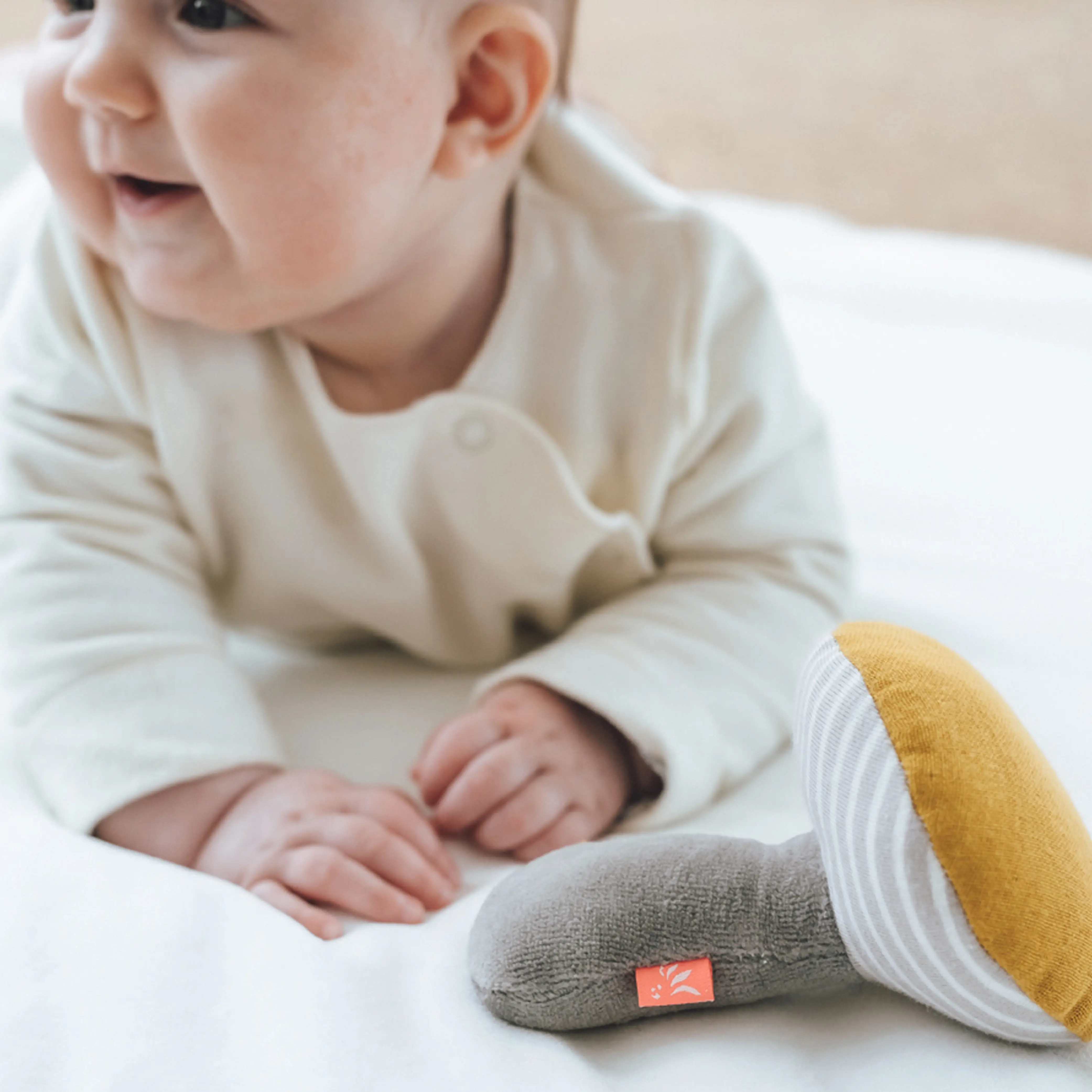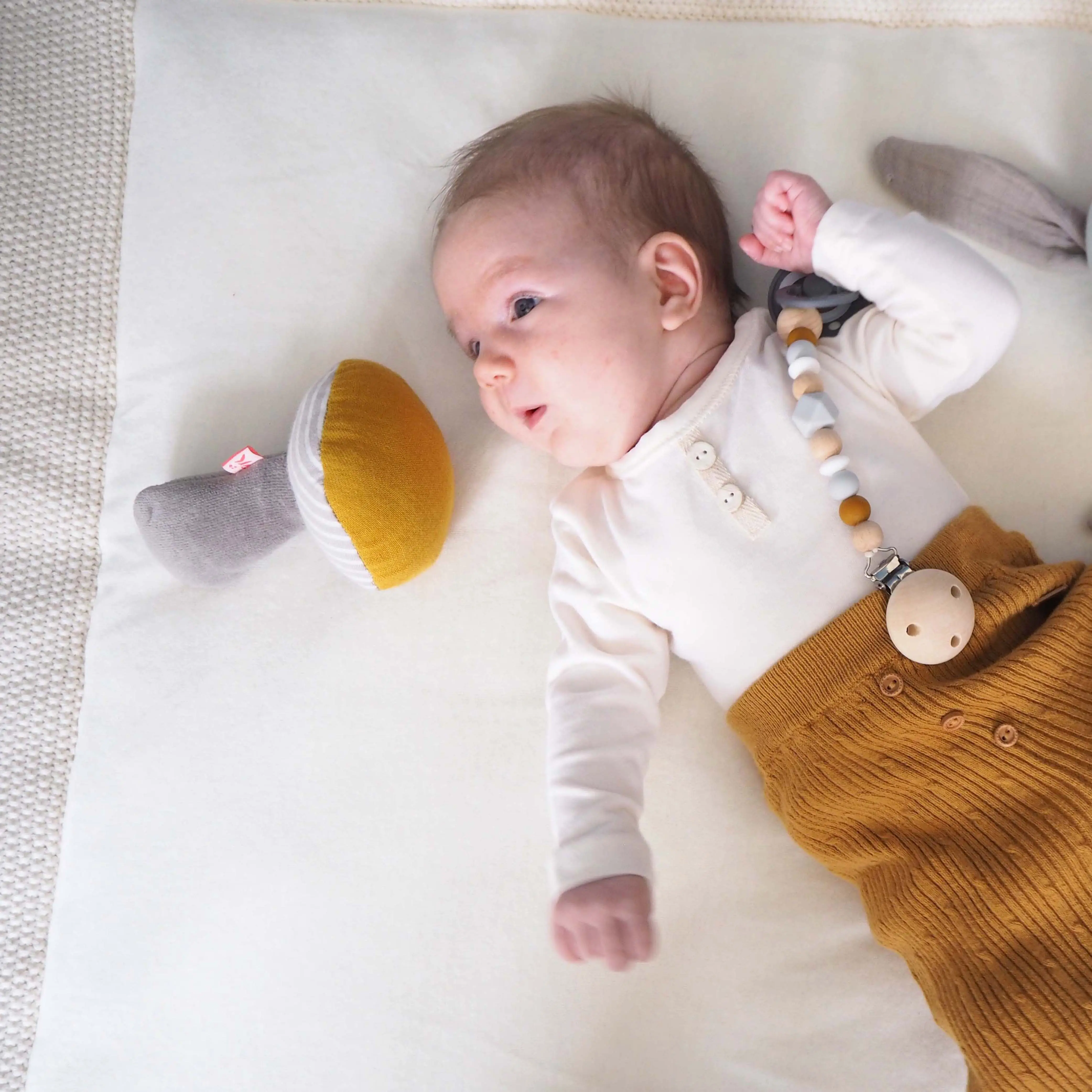A little forest snail would certainly crawl comfortably under this mushroom with its large mushroom head. Your baby can grasp this mushroom, with its fluffy style, with its little hands. This encourages your child's motor development. As soon as you move the soft mushroom and take it in your hand, a rattling sound comes from inside the mushroom. Your baby will listen and his acoustic abilities will be supported. Also a nice gift for birth.