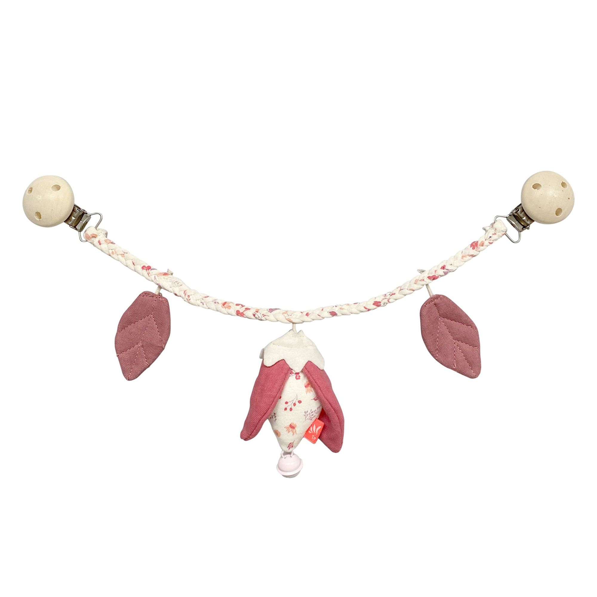 With the pram chain from kikadu made of organic cotton, your child will also be busy on the go. Due to the soft colors and the natural, detailed design, the baby toy goes well with the classic stroller colors. The bell on the flower and the rustling leaves encourage your baby to grasp it, which stimulates its senses. Thanks to the clip fasteners, the pram chain can be attached quickly and easily.