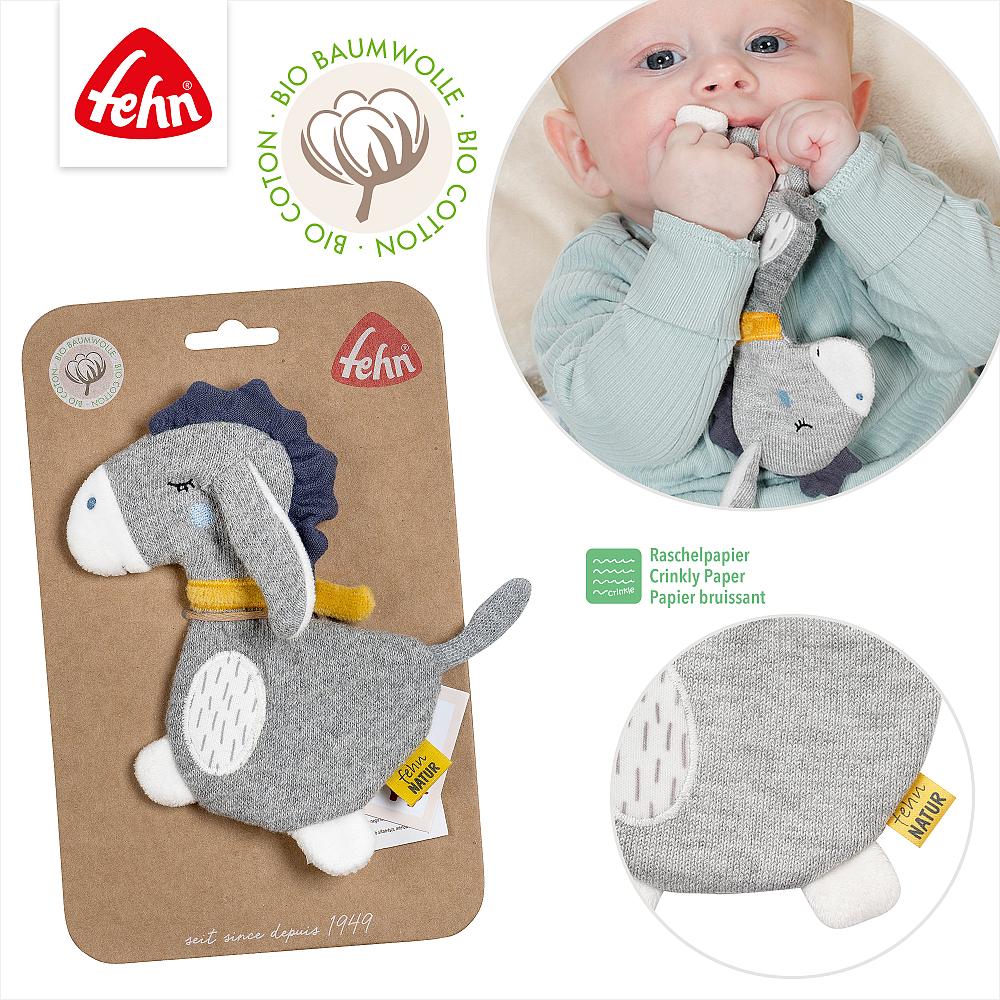 The soft and snuggly Crinkle Donkey from the fehnNATUR line is designed to capture a baby's curiosity right from the start. Made from certified organic cotton (kbA), it offers a fun crinkle sound and a cuddly shape that invites little hands to explore, feel, and play.