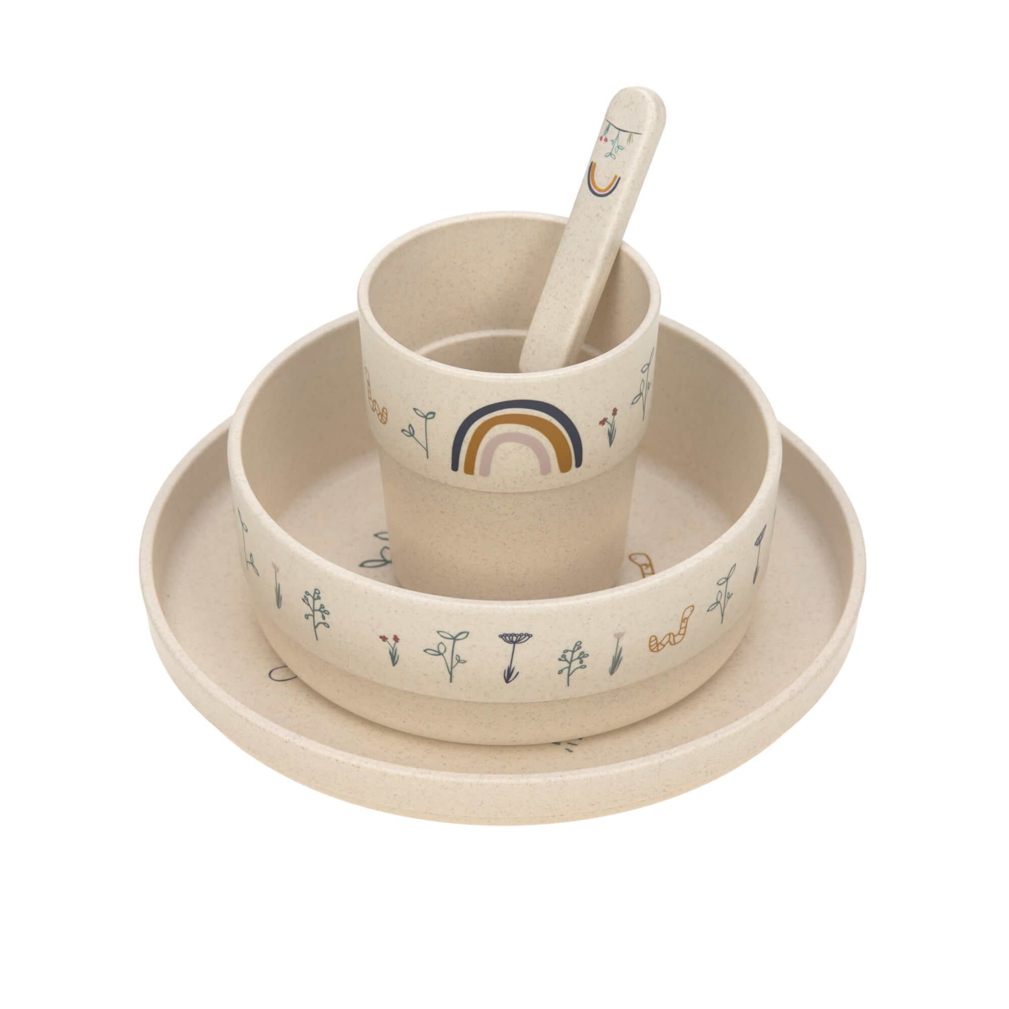 The tableware set garden explorer invites little foodies to explore nature even while sitting at the table! The set includes a plate, a small bowl, a mug and a spoon. The non-slip ring on the underside of the tableware ensures a better grip on the table. The children’s tableware set is not only BPA-free and very lightweight but it is also dishwasher and microwave safe. It is made of a mixture of polypropylene and cellulose and is thus more sustainable and resource-saving in its production than conventional polypropylene. Perfectly suitable for children 12 months and onwards.