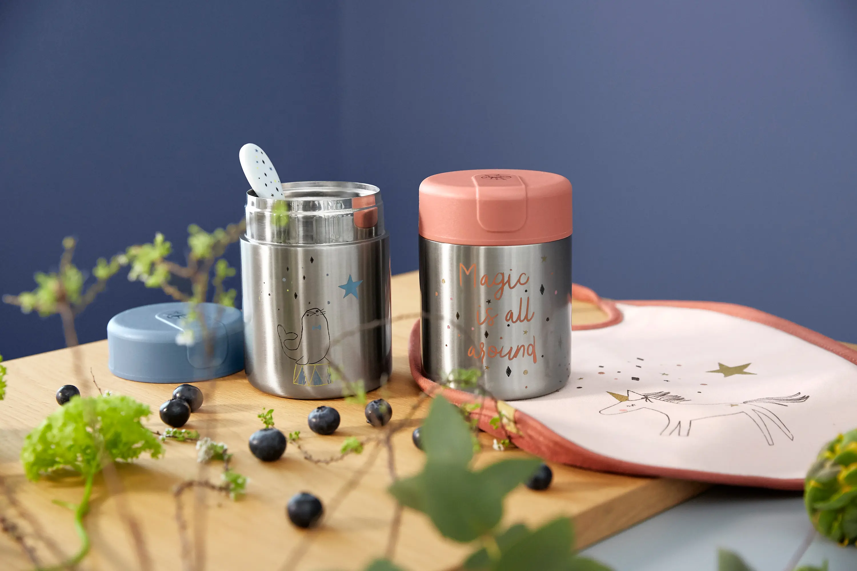 With the double-walled thermos flask made of stainless steel, semi-solid food or lunch for your little one is immediately ready to serve when you are on the go. The stainless food jar keeps food hot or cold and does not leave behind tastes or odors.The removable silicone ring in the lid ensures that nothing leaks out. The wide opening of the stainless steel flask makes it easy to fill, use and clean. It’s robust and non-breakable, as well as easy to handle and practical in catering for big and small appetites when on the go. The Thermos holds 315 ml.