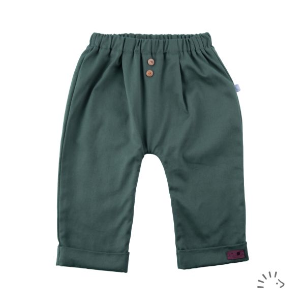 The comfortably cut of these classic trousers, which are fully lined with soft jersey, offer space for cloth nappy bums. With pleats and a brim on the leg. The drawn-in trouser elastic on the waist ensures optimum hold and can easily be adjusted through a small opening.