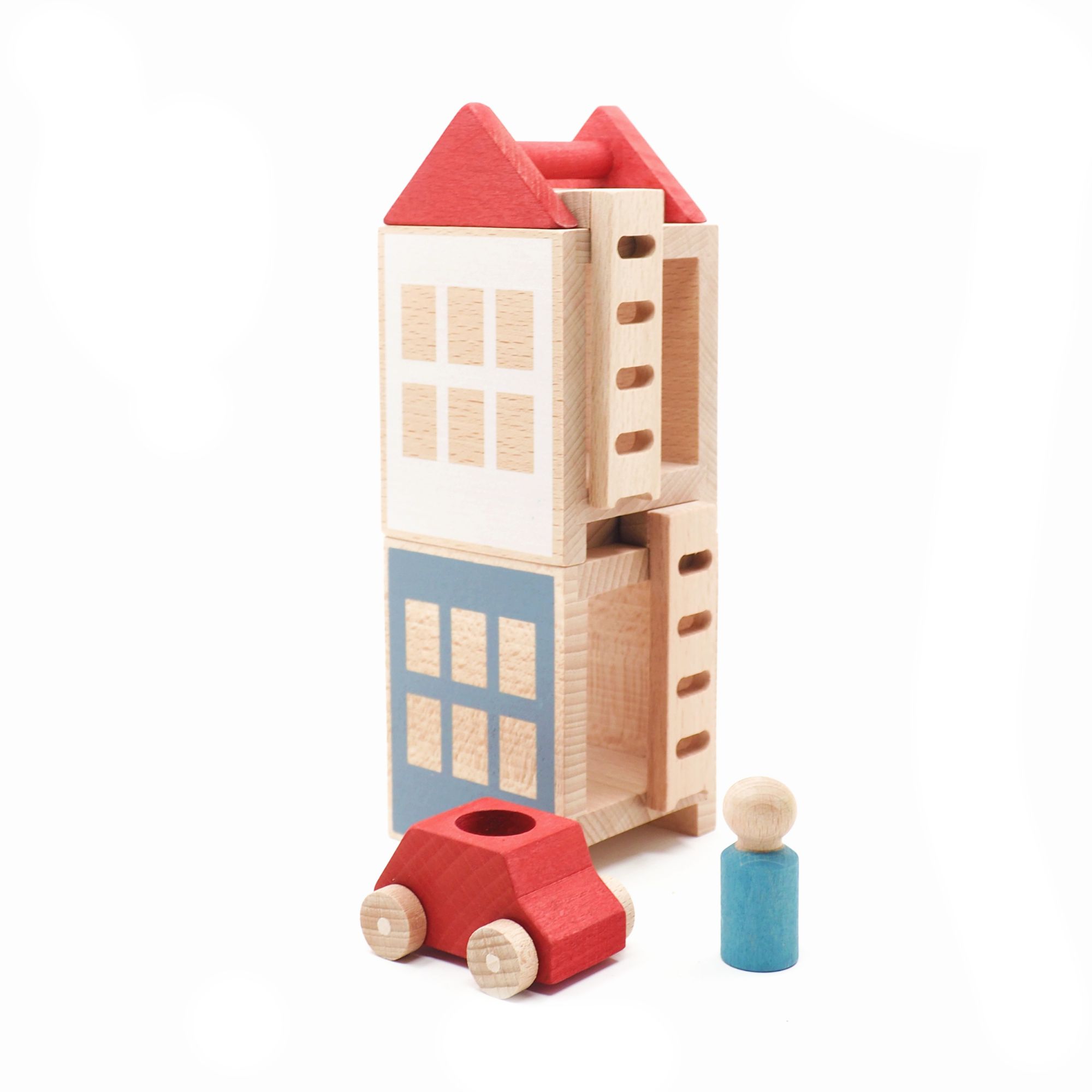 It consists of 2 stackable houses with 2 ladders, 1 wooden toy car, a figure and a roof. Lubulona enables children to create different buildings and have a great time with their own constructions, wooden toy cars and small figures.
