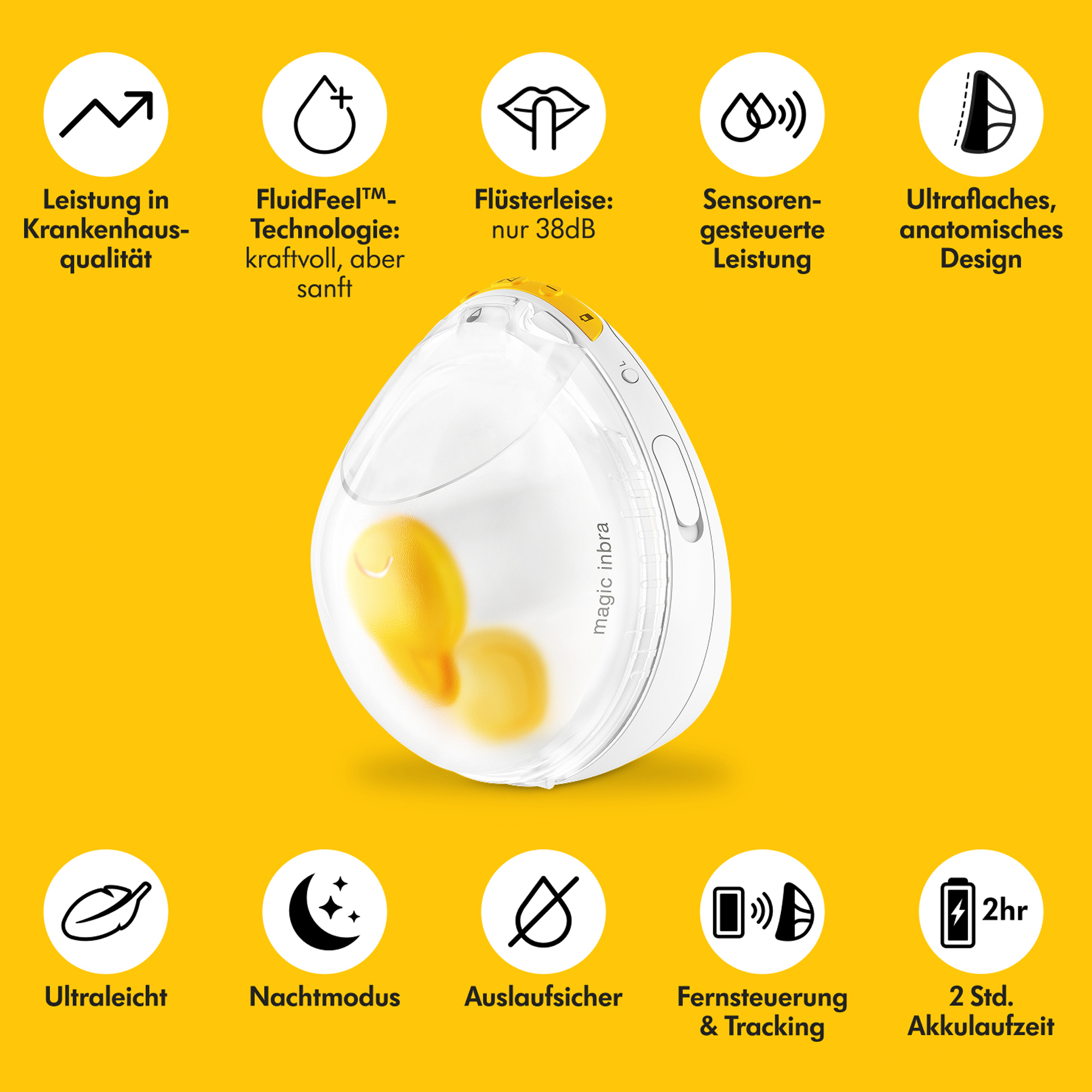 Thanks to its ultra-lightweight, quiet design and revolutionary FluidFeel™ technology, you can pump your breast milk conveniently and hands-free – directly in your bra. The Magic InBra™ mimics the natural sucking rhythm of a baby and gently warms the nipple, creating a breastfeeding-like environment. Its smart sensor control detects milk flow and automatically switches from stimulation to expression mode.