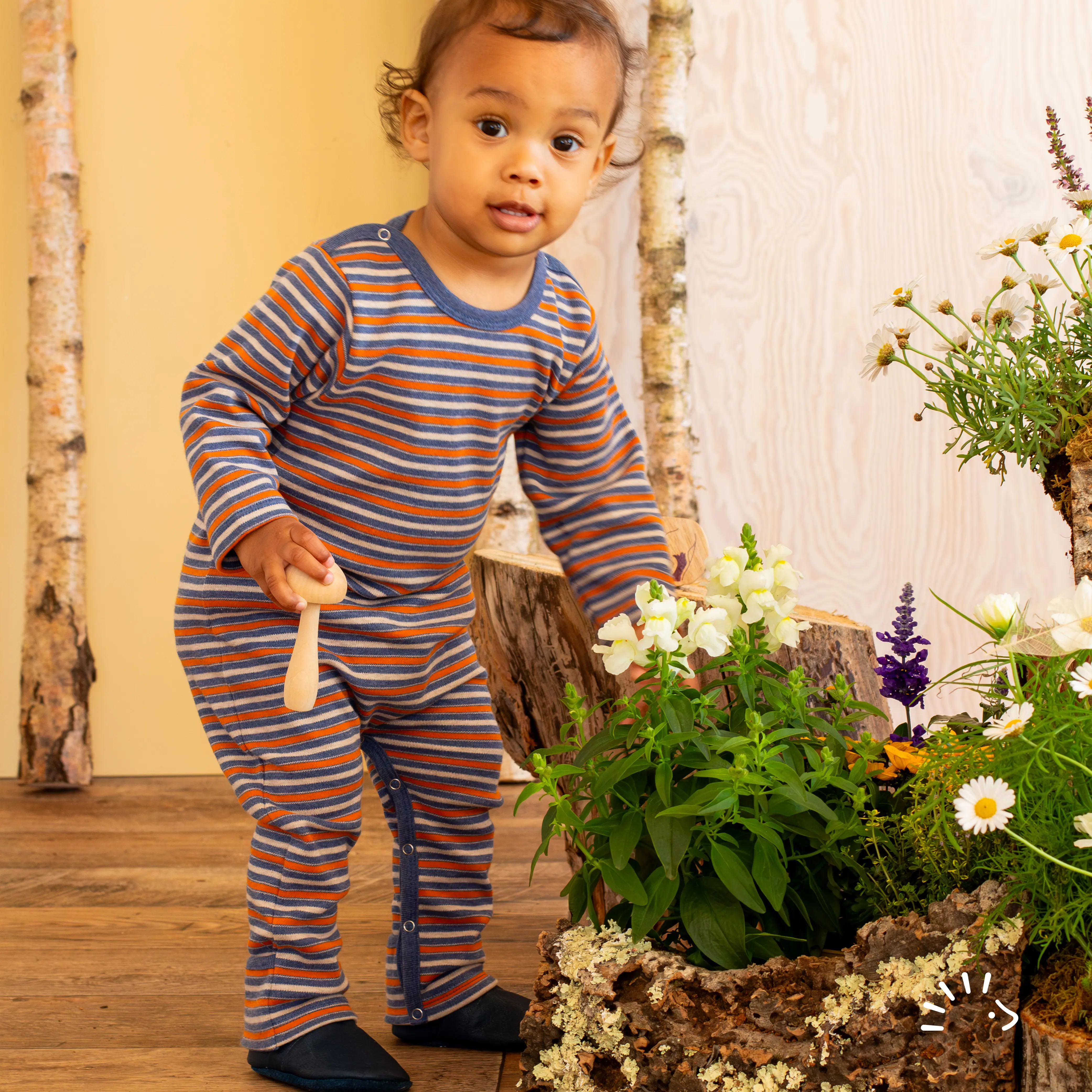 Our overall without feet made from certified cotton interlock is a casual Basic with long sleeves suitable for every day. Because of its open legs, romper is suitable for each foot length. Feet can also be closed by attached cuffs, which is very advantageous while sleeping for example. Snaps on both shoulders and in the crotch ensure easy dressing. The soft and skin-friendly interlock-material nestles comfortably on baby’s skin.