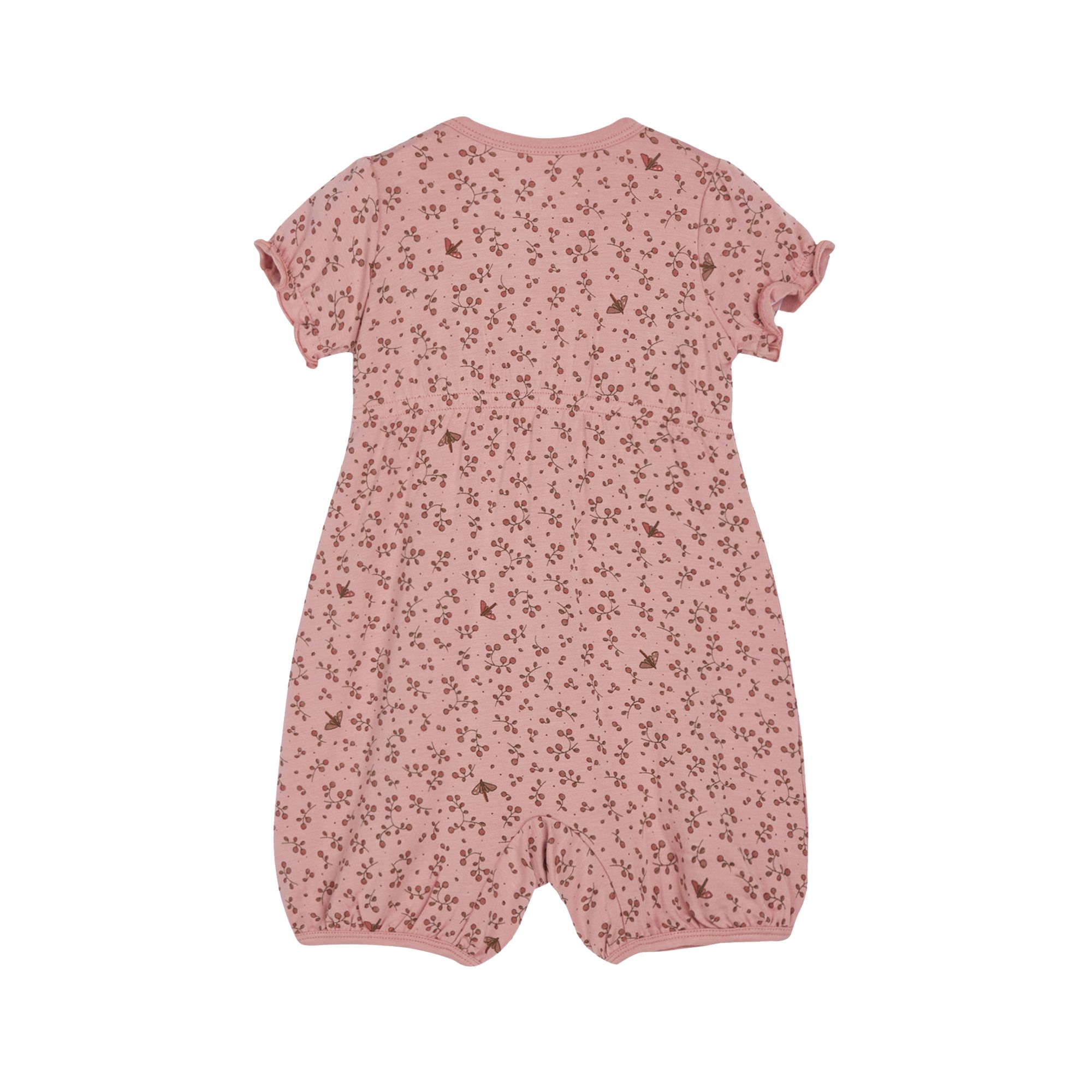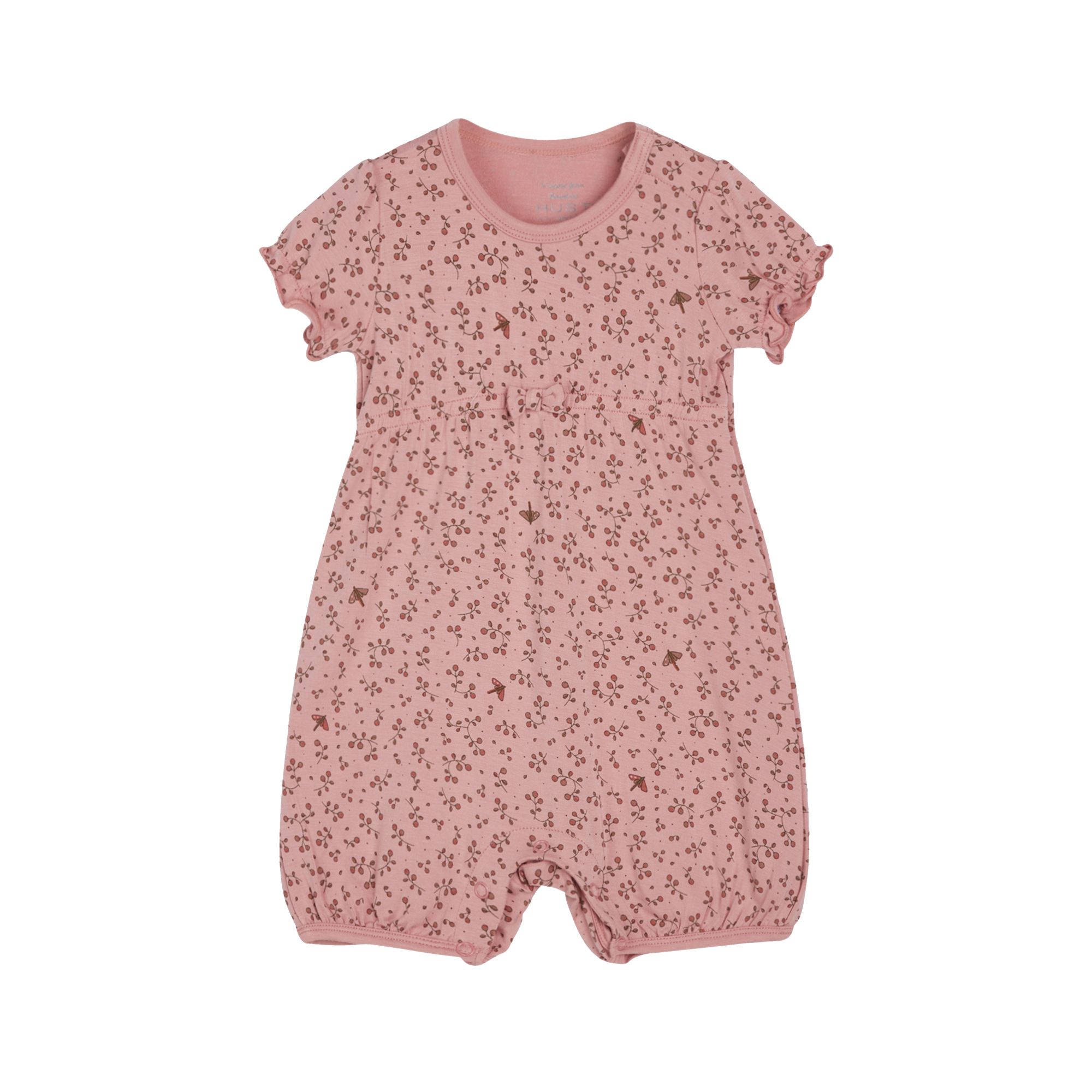 Short-sleeved summer jumpsuit made from elastic bamboo viscose with a floral print. The elastic band and the decorative bow at the waist give the romper a girlish charm. With elasticated sleeves and legs. Snaps on the left shoulder and between the legs. This product is Oeko-Tex 100® certified.