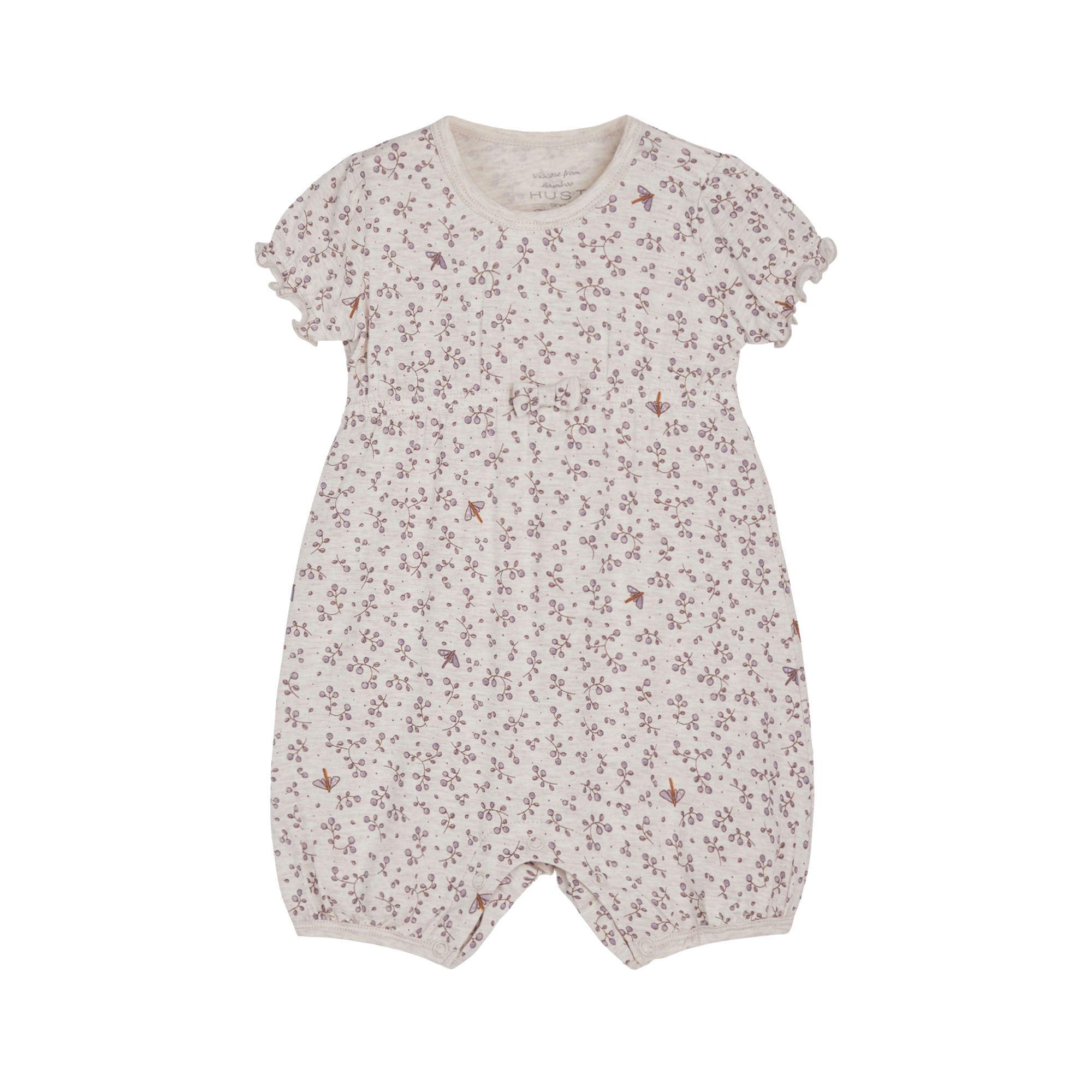 Short-sleeved summer jumpsuit made from elastic bamboo viscose with a floral print. The elastic band and the decorative bow at the waist give the romper a girlish charm. With elasticated sleeves and legs. Snaps on the left shoulder and between the legs. This product is Oeko-Tex 100® certified.