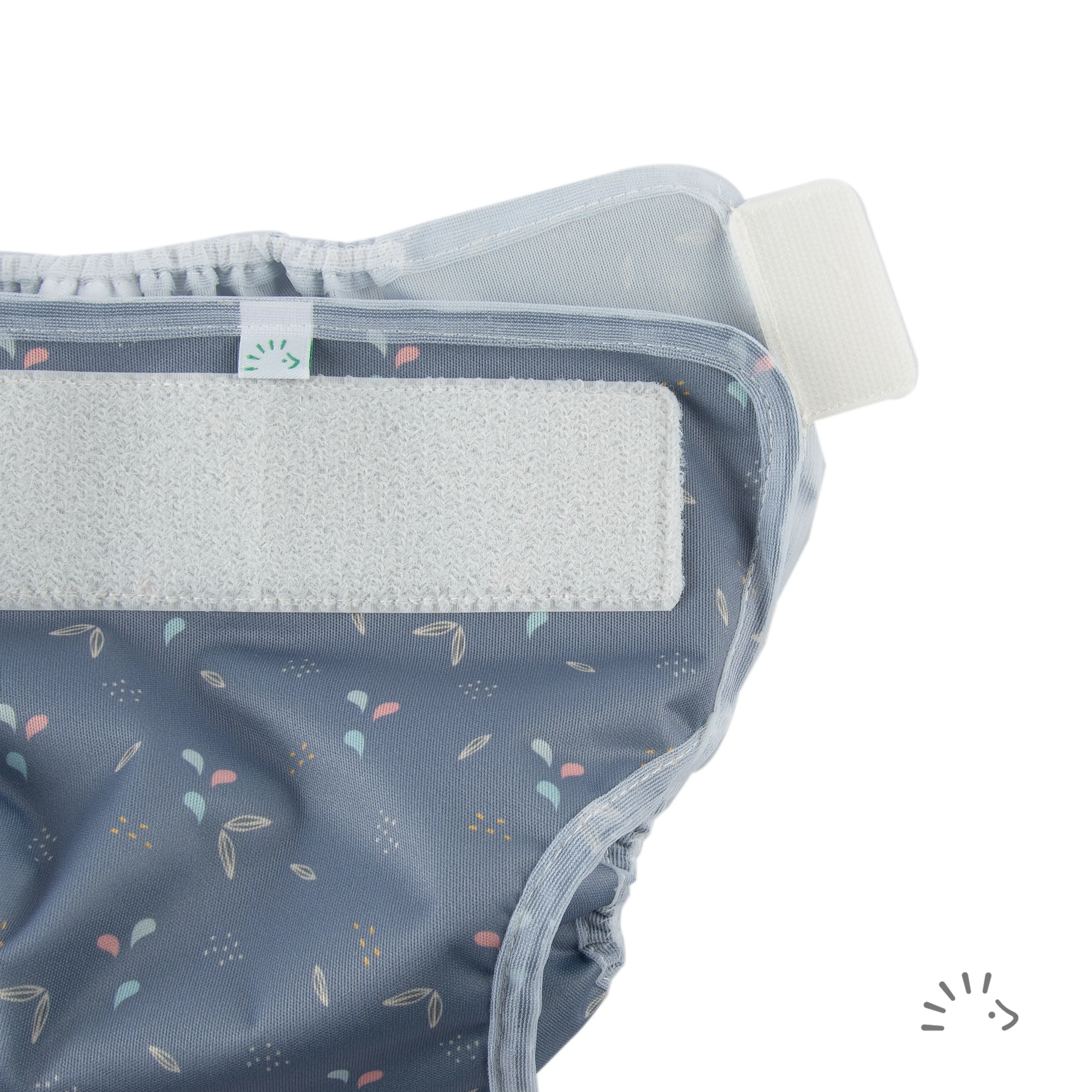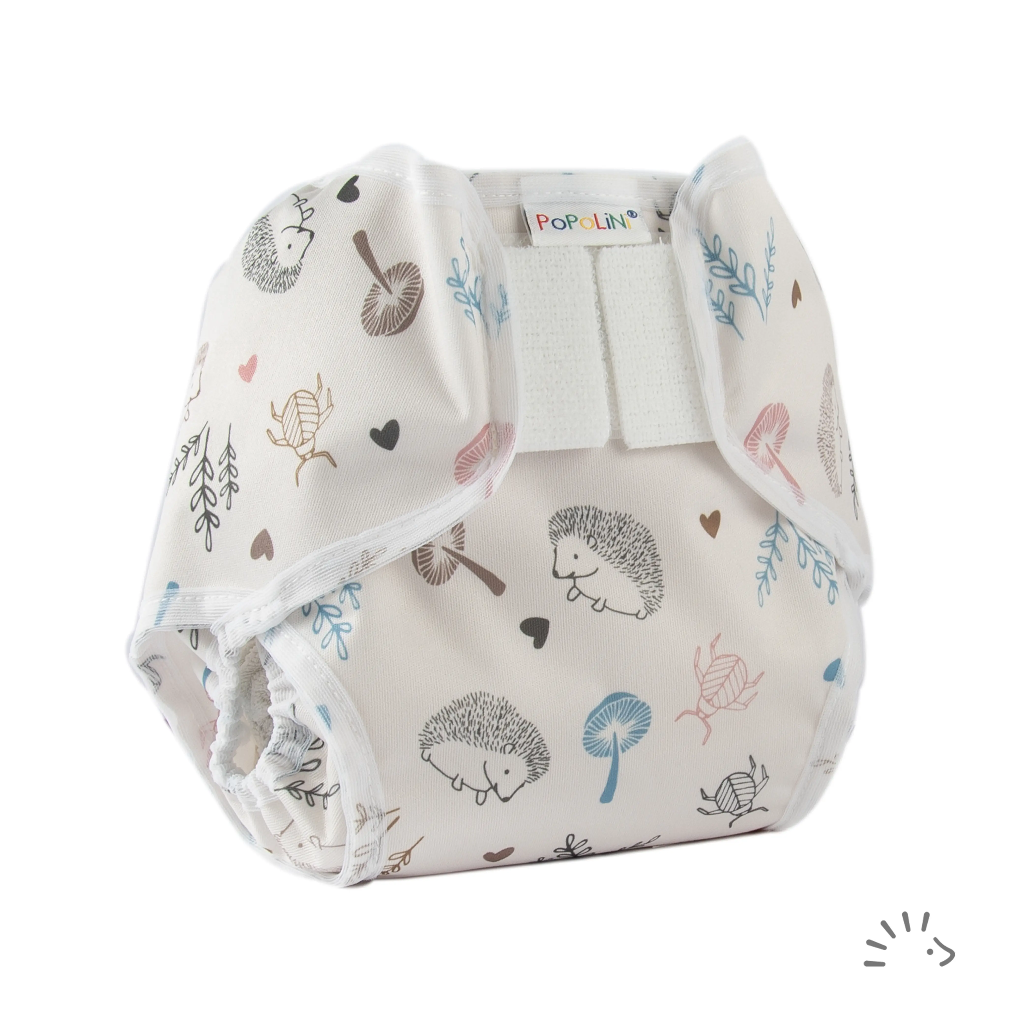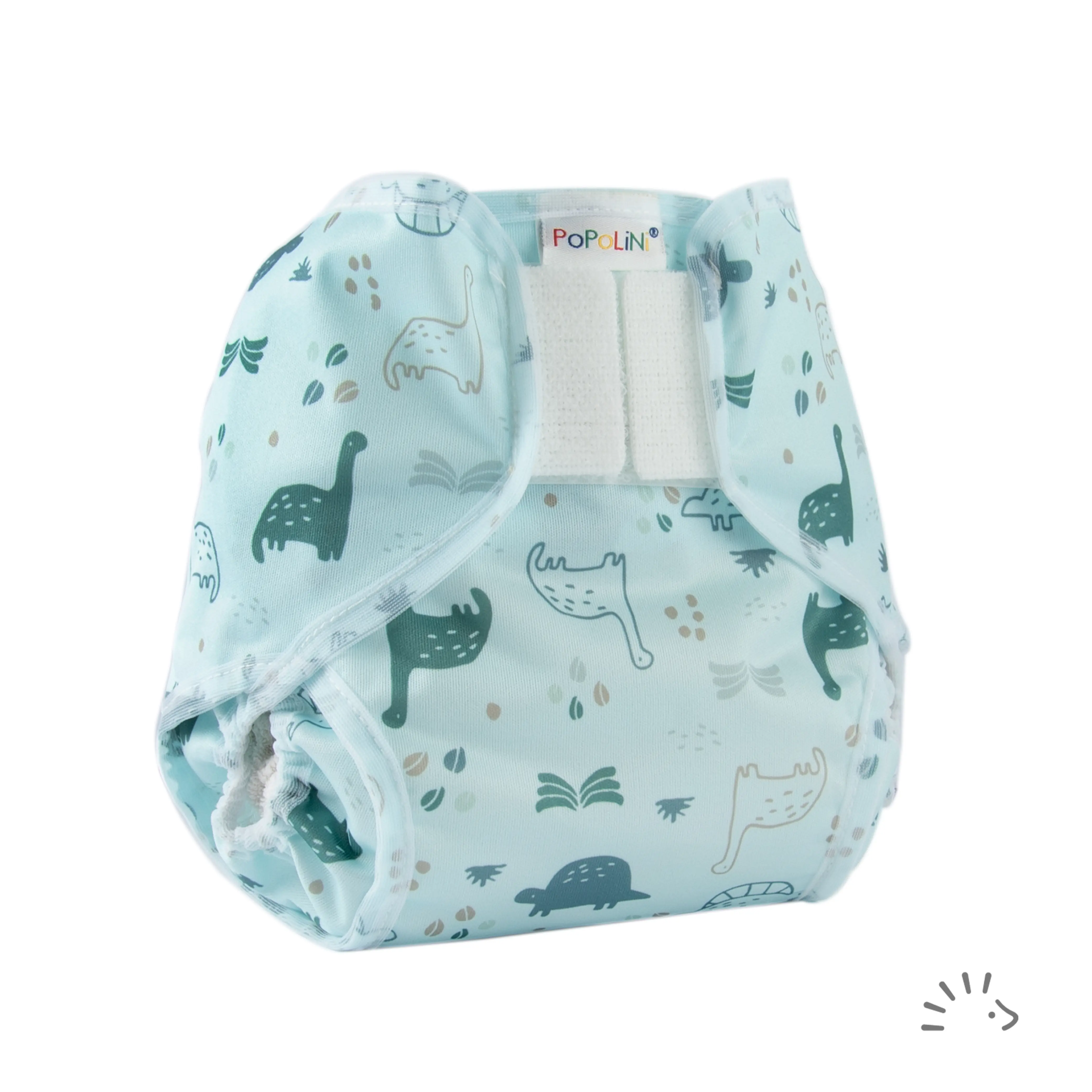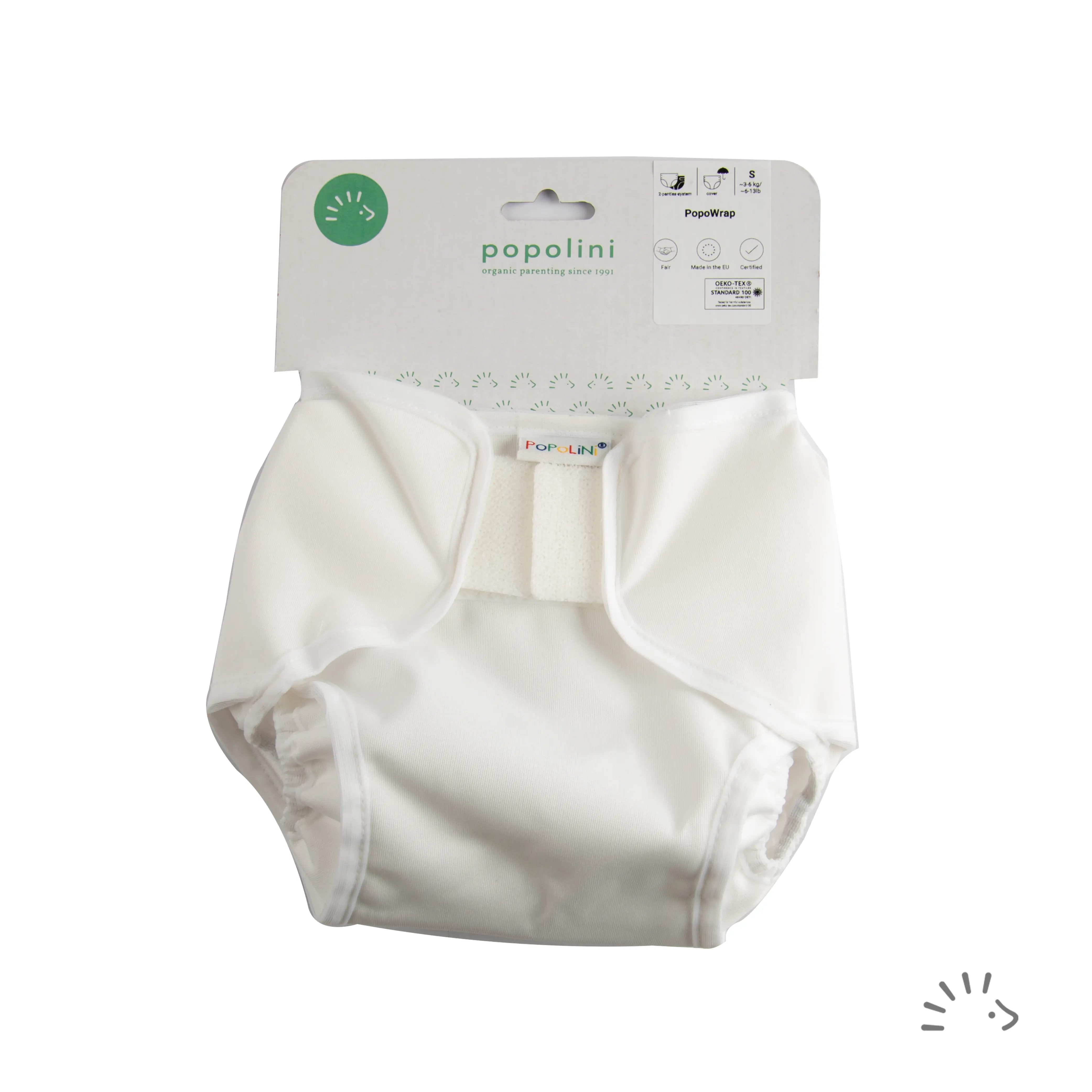The PopoWrap is a PU (polyurethane) coated cover with double elasticated leg cuffs. It is closed with Velcro and can be wrapped over any absorbent washable nappy.