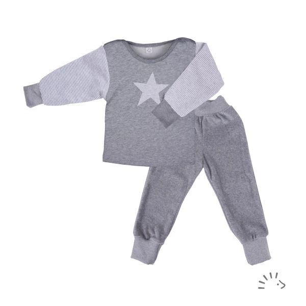 The pyjama velours is optimal for the whole season. The supple interlock fabric on the sleeves and the soft velours material for top and pants ensure a comfortable fit. Two snap fasteners on the side of the neck allow an easy dressing. The soft, elastic waistband on the belly of the pyjama pants ensures optimum grip. A special feature are the upturned cuffs and trouser legs, which makes the pyjamas grow with the child and also ensure that nothing slips when sleeping.