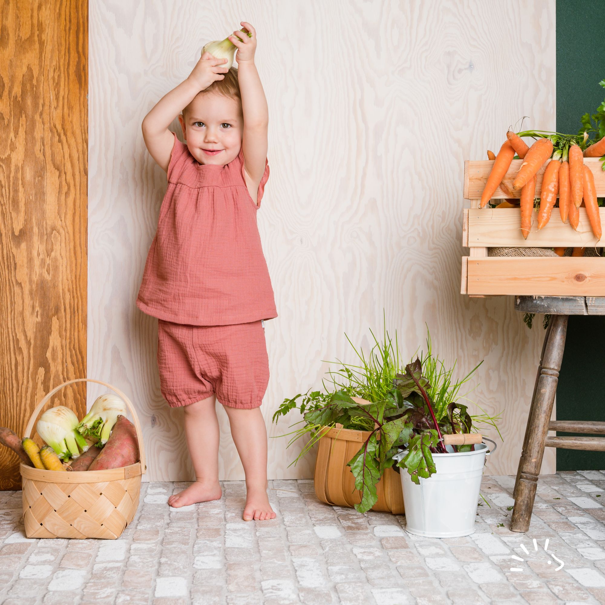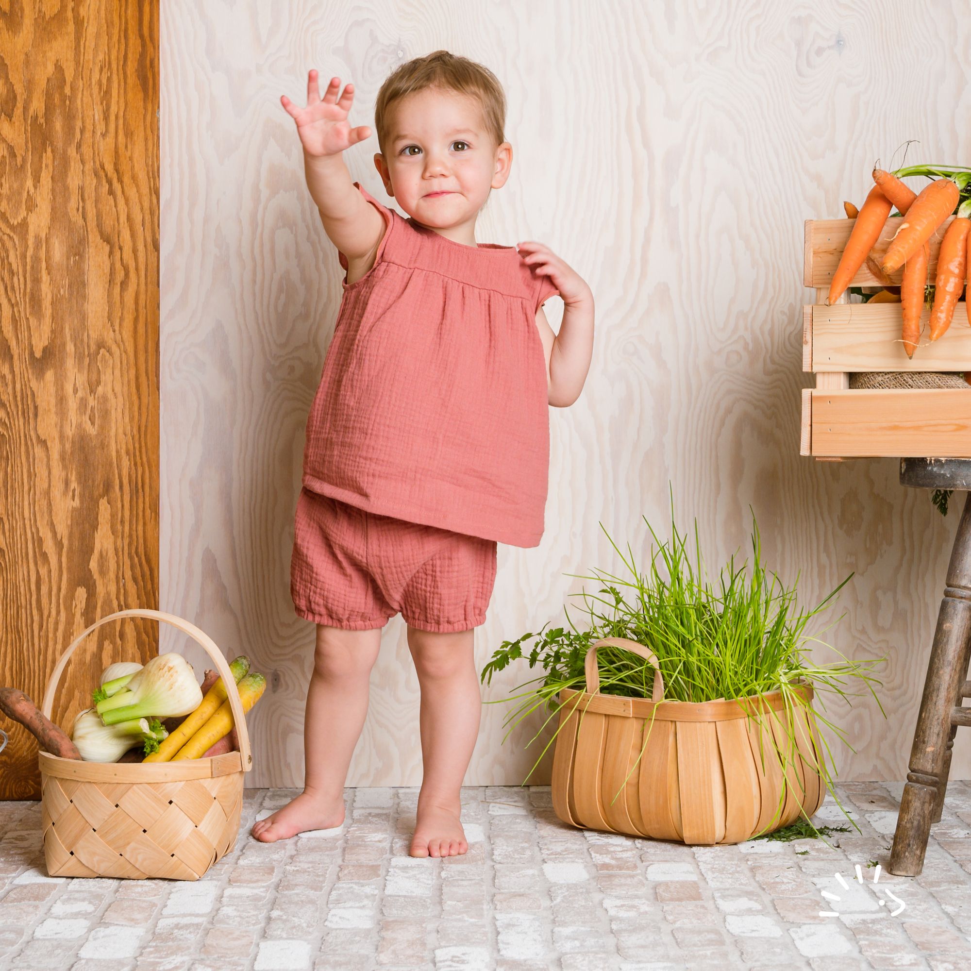 The Shirt style LENA made of airy cotton muslin is a delicate baby shirt for hot days. The skin-friendly fabric offers particularly high wearing comfort thanks to the special surface structure. Front part gathered, delicate shoulder ruffles. Loop closure with genuine coconut button at neckline.