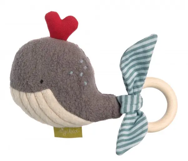 The little whale is a versatile toy for babies: it is easy to grip, with lots of corners for sucking, a wooden ring for biting, and with an acoustic charm. In addition, the small baby grabbing is made entirely from organic cotton, with a filling made from sheep's wool.