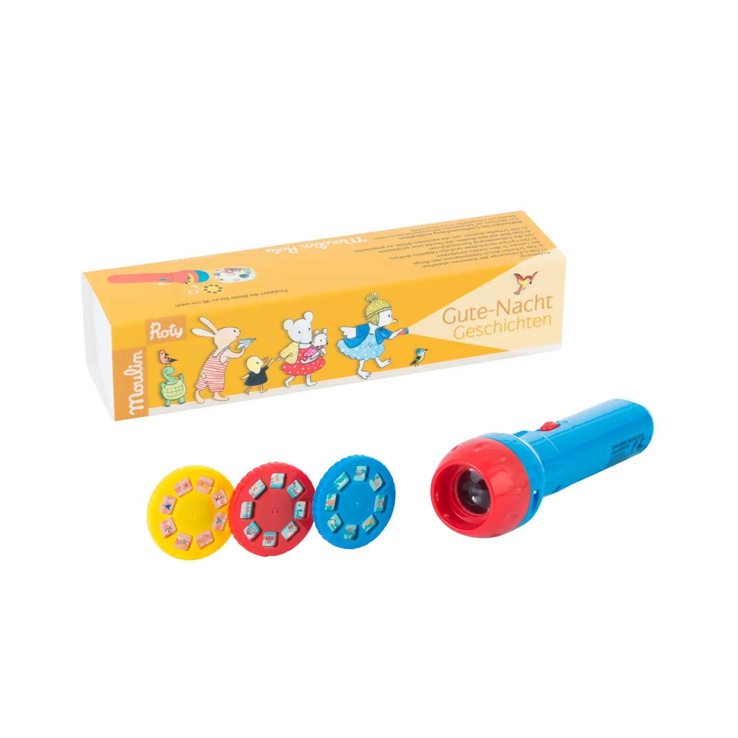 Introduce your little ones to the delightful world of "The Big Family" with this charming projection torch from Moulin Roty.