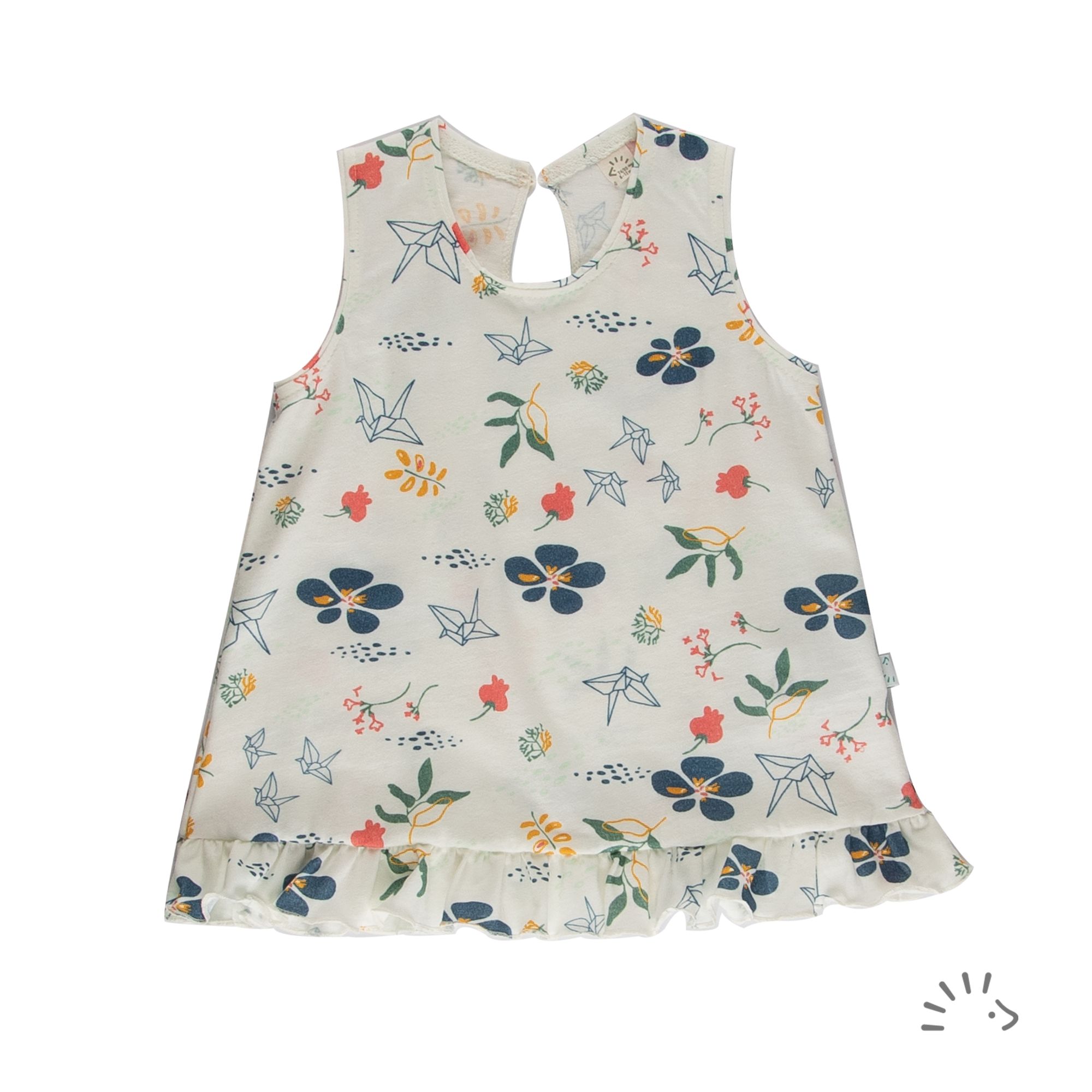 The summery tunic style MARA is made of finest Single Jersey. Simple A-line cut and decorative ruffled hem. This piece is ideal to combine with our pants CAPRI or Leggings. With loop closure on the backside with genuine mother-of-pearl button.
