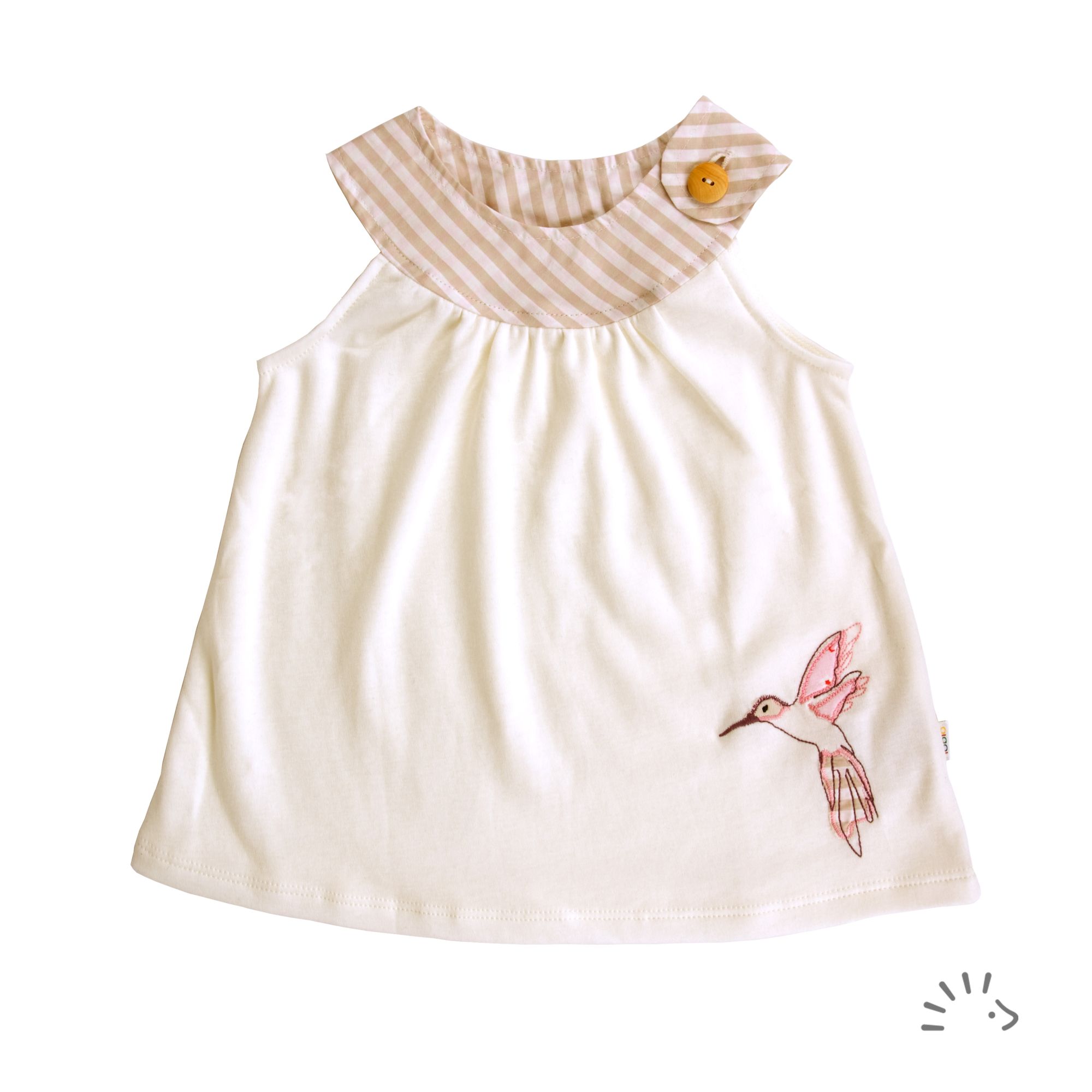 A fine hummingbird/flower embroidery application at the hemline serves as a special eye-catcher.
