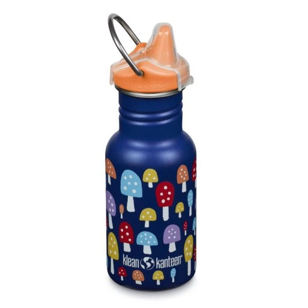 The Klean Kanteen Kid Classic stainless steel bottle with a 355 ml capacity features a charming mushroom design. The dark blue bottle is decorated with colorful mushrooms and nature motifs – perfect for little nature lovers. Whether hiking, playing at the park, or at school, this bottle is a reliable companion.
